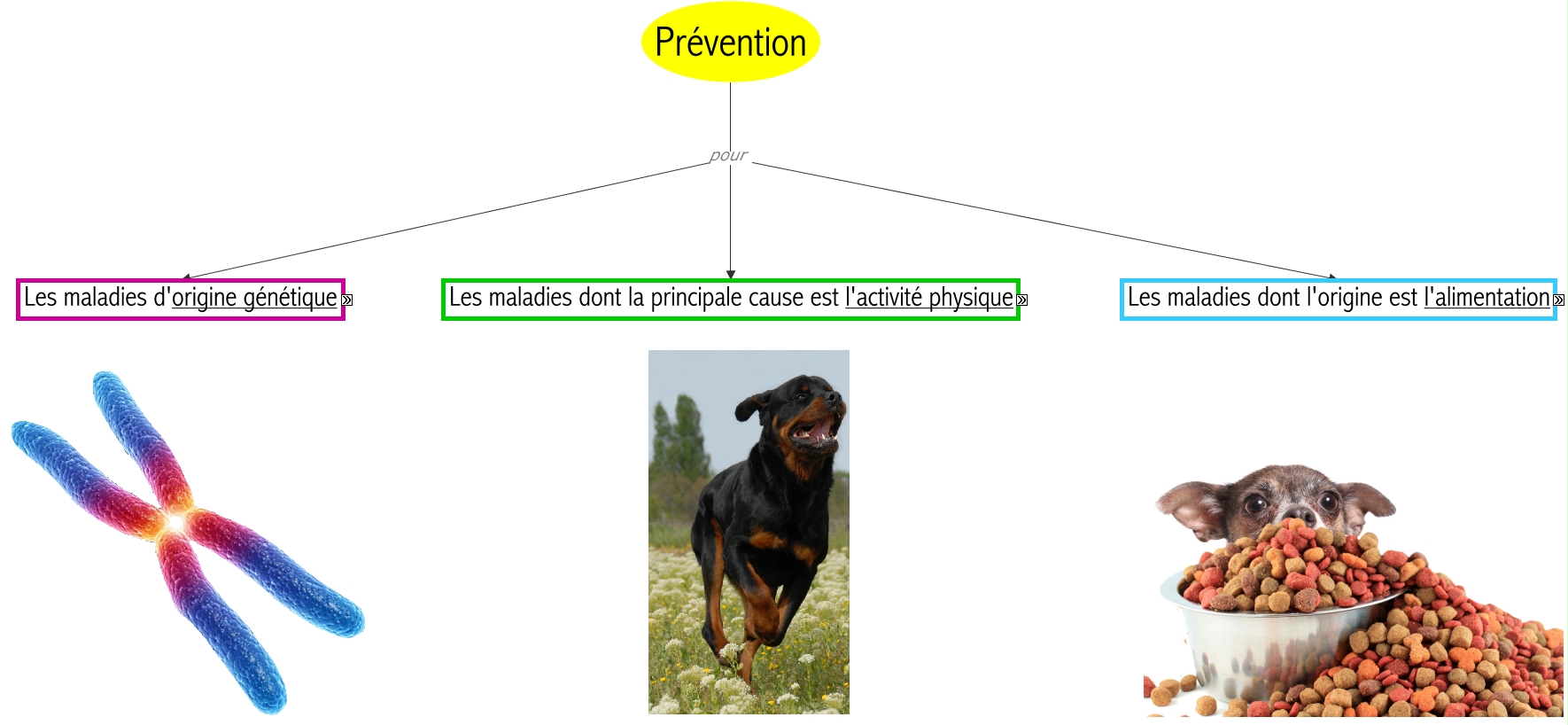 Cette carte de concepts créée avec IHMC CmapTools traite de: Prévention proposition, Radiographie Si indemne Apte à la reproduction, Limiter l'exercice lors des 15 premiers mois Eviter que le chien ne se tienne sur ses pattes arrières, Prévention pour Les maladies dont la principale cause est l'activité physique, Radiographie Si dysplasique Stérilisation conseillée, Limiter l'exercice lors des 15 premiers mois Eviter les sauts et les mouvements de montée sur un objet (véhicules, canapé, escalier,...), Radiographie Si dysplasique Retrait du circuit de reproduction, Adapter l'alimentation Eviter le surpoids, Accouplement et dysplasie de la hanche non-dysplasique x non-dysplasique = 25% de dysplasiques 75% de non-dysplasiques, Limiter l'exercice lors des 15 premiers mois Ne pas dépasser un temps de promenade en fonction de l'âge du chiot, Limiter l'exercice lors des 15 premiers mois Prévenir les risques de mauvaises chutes (sols glissants), Accouplement et dysplasie de la hanche dysplasique x non-dysplasique = 50% de dysplasiques 50% de non-dysplasiques, Dépistage génétique des deux parents des chiots via Radiographie, Accouplement et dysplasie de la hanche dysplasique x dysplasique = 75% dysplasiques 25% de non-dysplasiques, Prévention pour Les maladies d'origine génétique, Prévention pour Les maladies dont l'origine est l'alimentation, Adapter l'alimentation Augmenter l'apport de vitamine C (aide au dépôt de collagène)