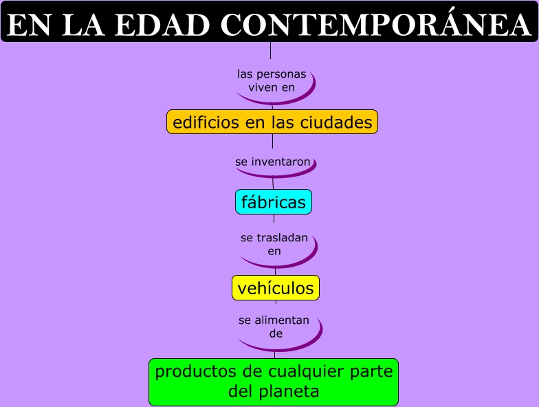 Este Cmap, tiene información relacionada con: En la Edad Contemporánea, EN LA EDAD CONTEMPORÁNEA las personas viven en edificios en las ciudades, edificios en las ciudades se inventaron fábricas, fábricas se trasladan en vehículos, vehículos se alimentan de productos de cualquier parte del planeta