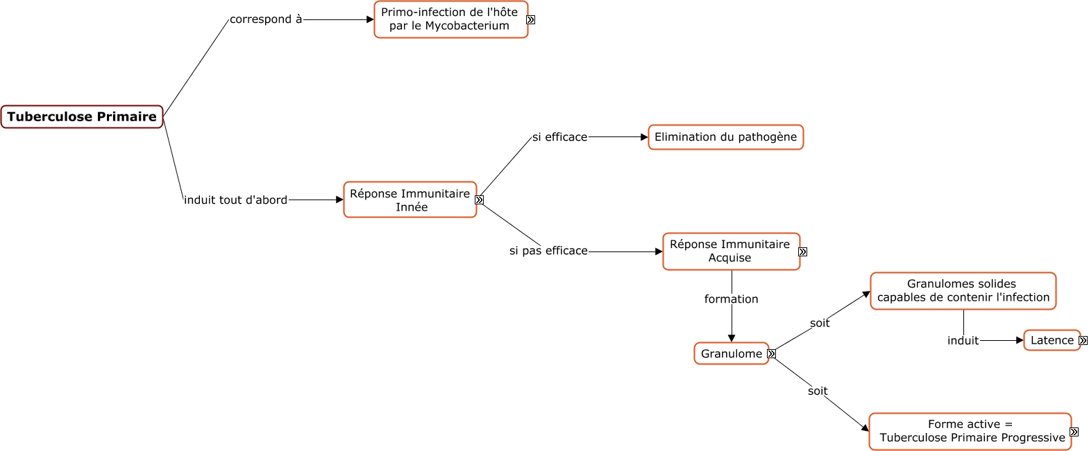 Esse mapa conceitual, produzido no IHMC CmapTools, tem a informação relacionada a: Tuberculose primaire, Multiples protéines impliquée dans Voies de présentation antigéniques MHC I et II, IFN-gamma permet Activation de macrophages, CD4+ produit Cytokines, CD4+, CD8+ et NK produit IFN-gamma, Fonction de Maitriser l'infection, Réponse Immunitaire Acquise via Production d'IFN-gamma, Granulome soit Forme active = Tuberculose Primaire Progressive, Réponse Immunitaire Acquise via Lymphocytes T, Tuberculose Primaire correspond à Primo-infection de l'hôte par le Mycobacterium, Correspond à la dissémination par voie sanguine de la bactérie à d'autres organes à partir des poumons vers Foie, rate, moelle osseuse, méninges, ..., Récepteurs de surface spécifiques Exemple Récepteur au mannose qui lie l'antigène LAM du Mycobacterium, Macrophages phagocytent grâce à Récepteurs de surface spécifiques, Tuberculose Primaire Progressive peut évoluer vers Complications, Maitrise du pathogène grâce à Hydrolases lysosomiales, Granulome se forme Par l'agrégation de cellules immunitaires sur le site d'infection, Mort cellulaire programmée caractérisée par la digestion de l'ADN génomique des cellules cibles implique Destruction de l'environnement protecteur du phagosome par la dissolution des organites du macrophage, Réponse immunitaire innée médiée principalement par Macrophages, Réponse Immunitaire Innée si efficace Elimination du pathogène, Latence = phase durant laquelle le Mycobacterium est en dormance car l'hôte génère une réponse immunitaire efficace qui maitrise le bacille dans le granulome, Granulome Fonctions