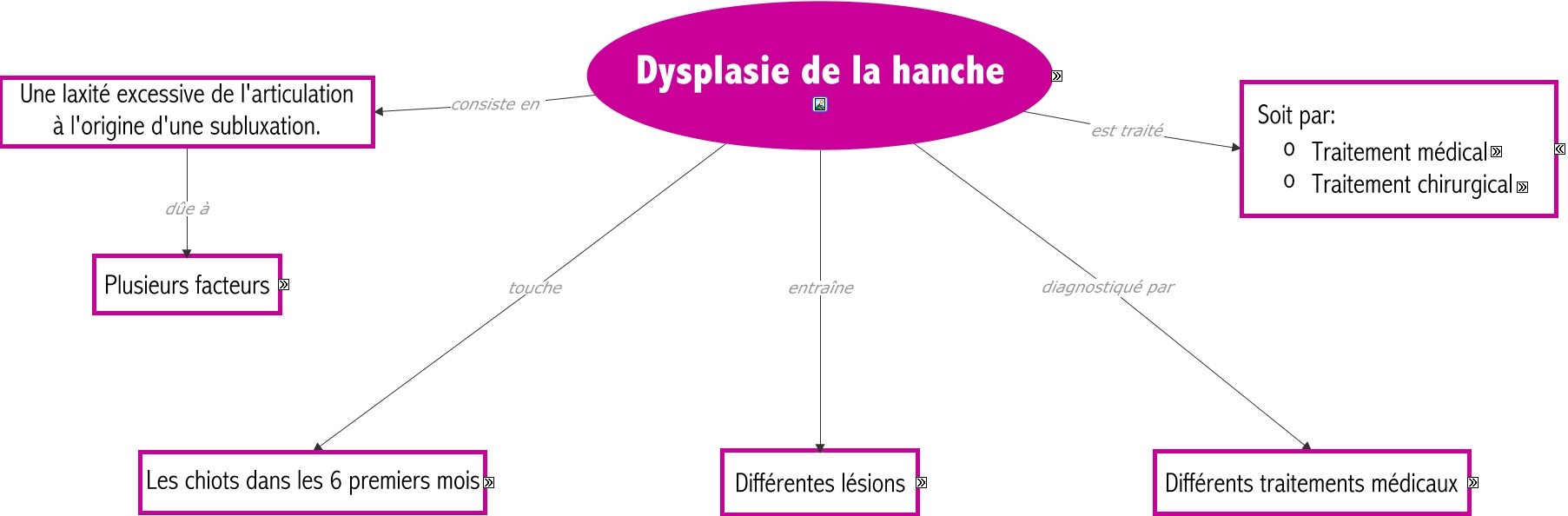 Cette carte de concepts créée avec IHMC CmapTools traite de: Dysplasie-de-la-hanche-Anne-Flore, Les chiots dans les 6 premiers mois de race Labrador (14%), sur le dos, les membres en extension mesure de l'angle de Norberg-Olson, mesure de l'angle de Norberg-Olson classification en 5 stades : A, B, C, D, E, Dans un second temps : des lésions progressives tel que Un étirement de la capsule articulaire, Dysplasie de la hanche est traité ????, Dysplasie de la hanche diagnostiqué par Différents traitements médicaux, Dysplasie de la hanche touche Les chiots dans les 6 premiers mois, Une laxité excessive de l'articulation à l'origine d'une subluxation. dûe à Plusieurs facteurs, Dans un premier temps : une inflammation locale et de l'arthrose et Dans un second temps : des lésions progressives, Dysplasie de la hanche consiste en Une laxité excessive de l'articulation à l'origine d'une subluxation., mesure de l'indice de distraction ou de l'indice de subluxation peut-être réalisé dès 4 mois, Dysplasie de la hanche entraîne Différentes lésions, Des facteurs extérieurs surpoids, Des facteurs extérieurs manque d'activité physique, Différentes lésions avec Dans un premier temps : une inflammation locale et de l'arthrose, Traitement chirurgical basé sur une prothèse de hanche, Des facteurs extérieurs excès d'activité physique, procédé "Penn-Hip" mesure de l'indice de distraction ou de l'indice de subluxation, Dans un second temps : des lésions progressives tel que Lésions des ligaments et des os, Par différents examens médicaux : et notament un examen radiographique