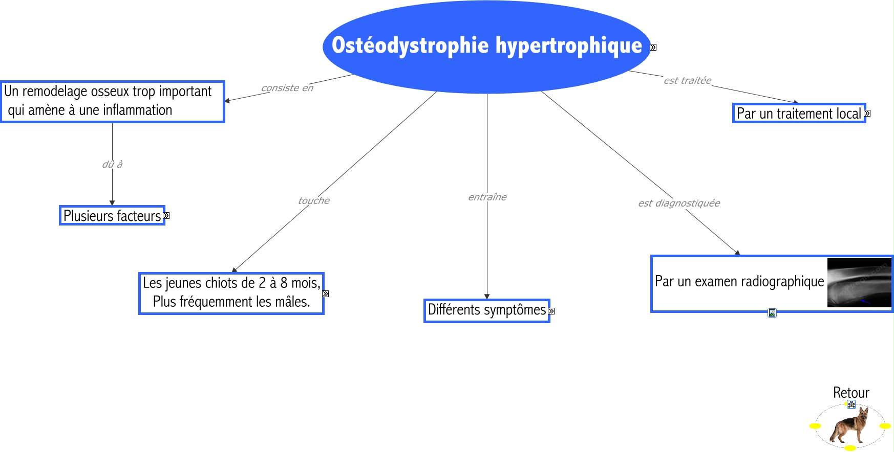 Cette carte de concepts créée avec IHMC CmapTools traite de: Ostéodystrophie-hypertrophique-Adeline, Les jeunes chiots de 2 à 8 mois Plus fréquemment les mâles De race Golden retriever, Ostéodystrophie hypertrophique touche Les jeunes chiots de 2 à 8 mois, Plus fréquemment les mâles., Ostéodystrophie hypertrophique consiste en Un remodelage osseux trop important qui amène à une inflammation, Ostéodystrophie hypertrophique est diagnostiquée Par un examen radiographique, Douleur Boiterie, Traitement médicamenteux : anti-inflammatoires anti-diarrhéiques suivi Guérison complète à la fin de la croissance, Ostéodystrophie hypertrophique entraîne Différents symptômes, Les jeunes chiots de 2 à 8 mois Plus fréquemment les mâles De race Berger allemand, Les jeunes chiots de 2 à 8 mois Plus fréquemment les mâles De race Labrador, Afflaiblissement général Troubles digestifs: diarrhées, Les jeunes chiots de 2 à 8 mois Plus fréquemment les mâles De race Setter, Un remodelage osseux trop important qui amène à une inflammation dû à Plusieurs facteurs, Ostéodystrophie hypertrophique est traitée Par un traitement local, Les jeunes chiots de 2 à 8 mois Plus fréquemment les mâles De race Doberman, Les jeunes chiots de 2 à 8 mois Plus fréquemment les mâles De race Saint-Bernard, Afflaiblissement général Troubles respiratoires: jetage pneumonie