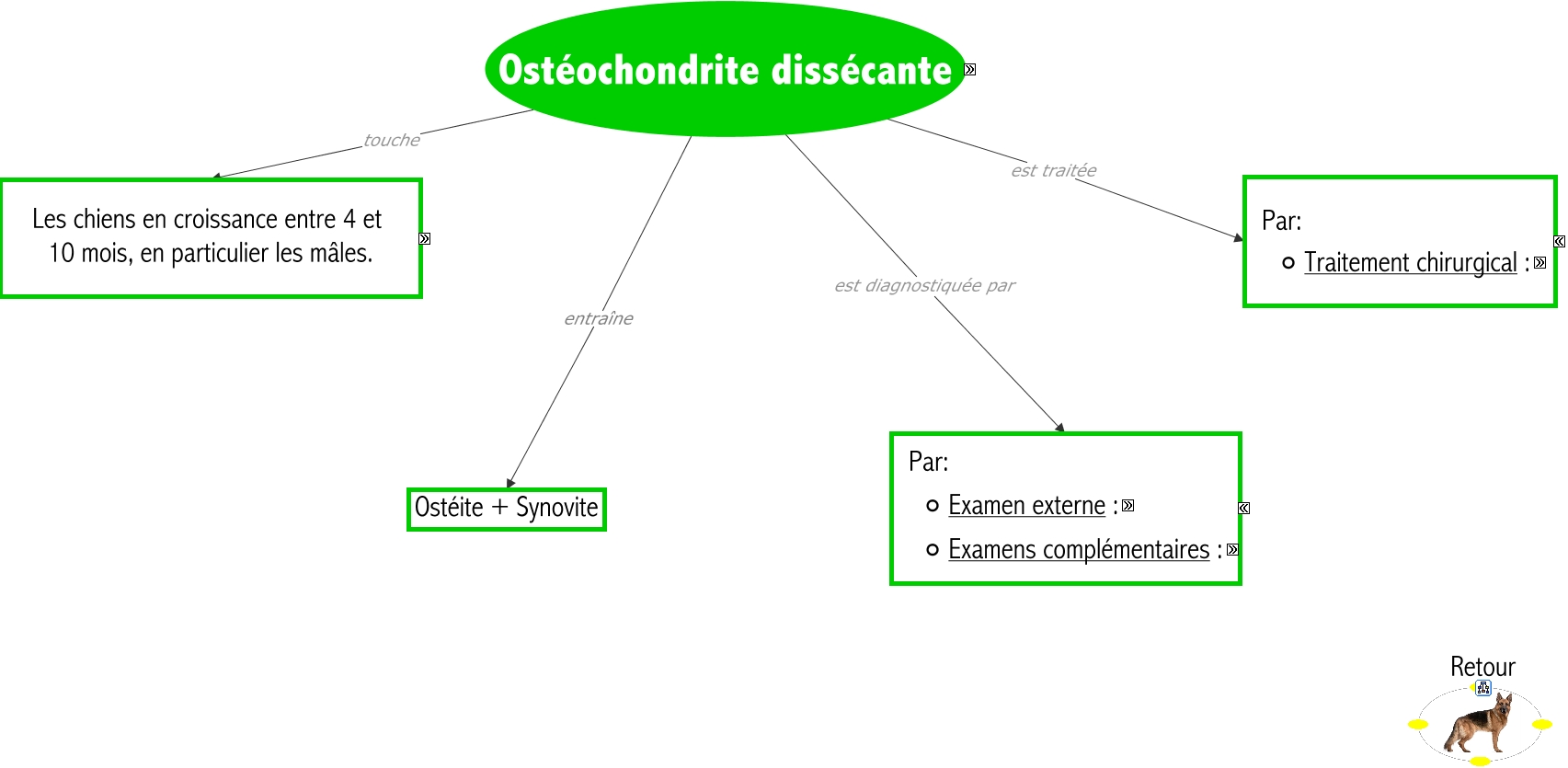Cette carte de concepts créée avec IHMC CmapTools traite de: Ostéochondrite-dissécante-Roxanne, ∘ Examen externe : où l'on recherche Une limitation des amplitudes d'extension et de flexion, due à la douleur, ∘ Traitement chirurgical : Curetage de la lésion, Les chiens en croissance entre 4 et 10 mois, en particulier les mâles. Tels que Rottweiler, ∘ Examen externe : où l'on recherche Une boiterie qui s'aggrave à l'effort, Les chiens en croissance entre 4 et 10 mois, en particulier les mâles. Tels que Golden retriever, ∘ Examens complémentaires : Ponction articulaire → Afin d'exclure l'arthrite, ∘ Examen externe : où l'on recherche Un épanchements et des crépitements articulaires, Les chiens en croissance entre 4 et 10 mois, en particulier les mâles. Tels que Berger allemand, Les chiens en croissance entre 4 et 10 mois, en particulier les mâles. Tels que Labrador, Ostéochondrite dissécante entraîne Ostéite + Synovite, Les chiens en croissance entre 4 et 10 mois, en particulier les mâles. Tels que Setter, ∘ Traitement chirurgical : Extraction des fragments cartilagineux, ∘ Examens complémentaires : Radiographie → Afin d'exclure la fracture → Recherche de lésions d'OCD