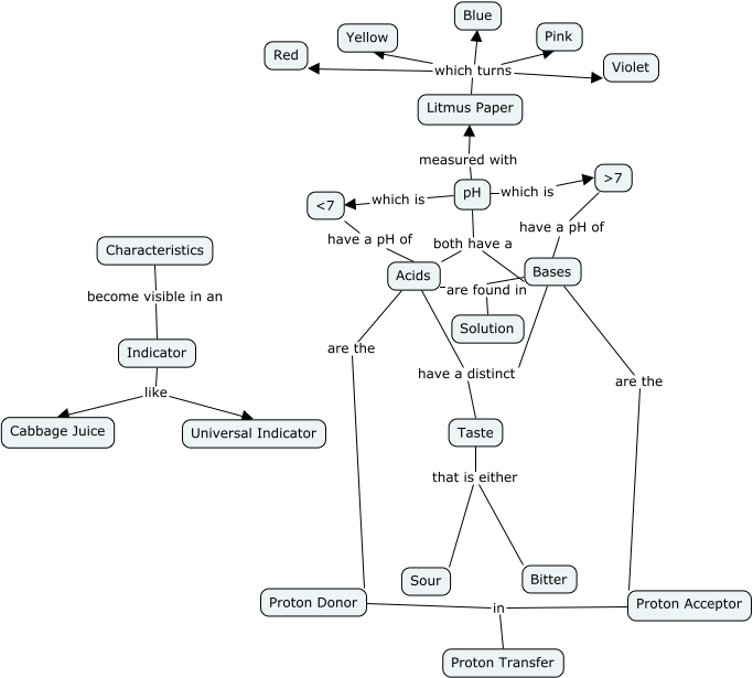This Concept Map, created with IHMC CmapTools, has information related to: AcidsBases, pH both have a Bases, pH both have a Acids, Litmus Paper which turns Yellow, pH which is ɳ, Litmus Paper which turns Blue, Proton Acceptor in Proton Transfer, Acids are the Proton Donor, Bases are the Proton Acceptor, Proton Donor in Proton Transfer, Indicator like Cabbage Juice, Taste that is either Sour, Solution are found in Acids, Litmus Paper which turns Pink, Acids have a distinct Taste, ɟ have a pH of Acids, pH measured with Litmus Paper, Taste that is either Bitter, Litmus Paper which turns Red, Characteristics become visible in an Indicator, Litmus Paper which turns Violet