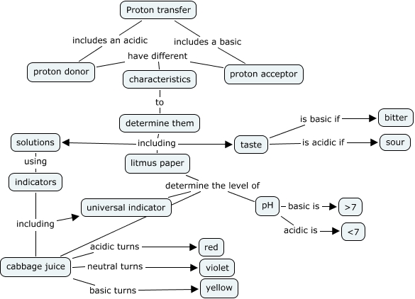 This Concept Map, created with IHMC CmapTools, has information related to: Acid-Base, indicators including cabbage juice, Proton transfer includes an acidic proton donor, cabbage juice neutral turns violet, indicators including universal indicator, litmus paper determine the level of pH, determine them including solutions, taste is basic if bitter, pH basic is ɳ, determine them including taste, universal indicator determine the level of pH, cabbage juice basic turns yellow, determine them including litmus paper, Proton transfer includes a basic proton acceptor, proton donor have different characteristics, cabbage juice determine the level of pH, cabbage juice acidic turns red, characteristics to determine them, pH acidic is ɟ, solutions using indicators, taste is acidic if sour