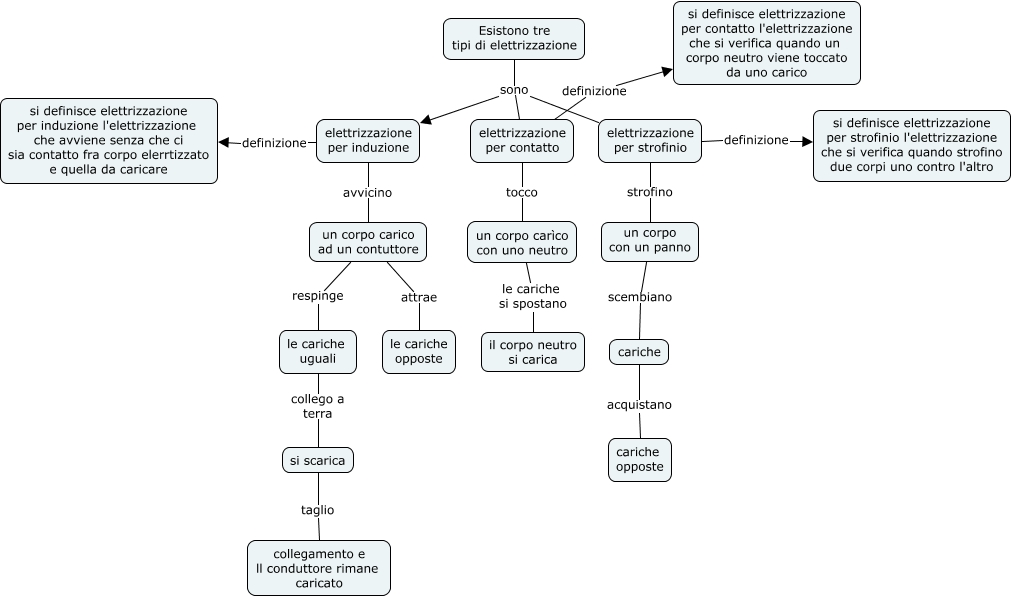 Questa Cmap, creata con IHMC CmapTools, contiene informazioni relative a: Elettrizzazione dei corpi, si scarica taglio collegamento e ll conduttore rimane caricato, un corpo carìco con uno neutro le cariche si spostano il corpo neutro si carica, le cariche uguali collego a terra si scarica, Esistono tre tipi di elettrizzazione sono elettrizzazione per contatto, un corpo carico ad un contuttore attrae le cariche opposte, Esistono tre tipi di elettrizzazione sono elettrizzazione per strofinio, elettrizzazione per contatto definizione si definisce elettrizzazione per contatto l'elettrizzazione che si verifica quando un corpo neutro viene toccato da uno carico, un corpo carico ad un contuttore respinge le cariche uguali, elettrizzazione per strofinio definizione si definisce elettrizzazione per strofinio l'elettrizzazione che si verifica quando strofino due corpi uno contro l'altro, elettrizzazione per induzione avvicino un corpo carico ad un contuttore, elettrizzazione per induzione definizione si definisce elettrizzazione per induzione l'elettrizzazione che avviene senza che ci sia contatto fra corpo elerrtizzato e quella da caricare, elettrizzazione per contatto tocco un corpo carìco con uno neutro, elettrizzazione per strofinio strofino un corpo con un panno, Esistono tre tipi di elettrizzazione sono elettrizzazione per induzione, cariche acquistano cariche opposte, un corpo con un panno scembiano cariche