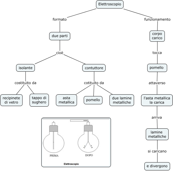 Questa Cmap, creata con IHMC CmapTools, contiene informazioni relative a: Elettroscopio, corpo carico tocca pomello, pomello attaverso l'asta metallica la carica, l'asta metallica la carica arriva lamine metalliche, isolante costituito da recipinete di vetro, due parti cioè isolante, due parti cioè contuttore, isolante costituito da tappo di sughero, Elettroscopio formato due parti, Elettroscopio funzionamento corpo carico, contuttore cotituito da asta metallica, contuttore cotituito da pomello, contuttore cotituito da due lamine metalliche, lamine metalliche si caricano e divergono