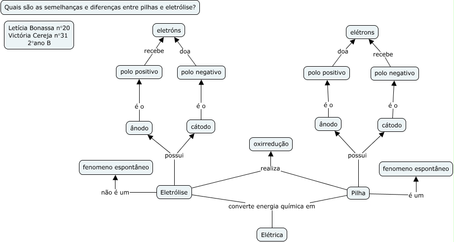 Esse mapa conceitual, produzido no IHMC CmapTools, tem a informação relacionada a: diferenças entre pilha e eletrólise, Le Bonassa e Victória Cereja, ânodo é o polo positivo, polo positivo recebe eletróns, ânodo é o polo positivo, Eletrólise realiza oxirredução, cátodo é o polo negativo, Eletrólise converte energia química em Elétrica, Pilha realiza oxirredução, Eletrólise possui ânodo, polo positivo doa elétrons, Pilha converte energia química em Elétrica, Eletrólise não é um fenomeno espontâneo, cátodo é o polo negativo, Pilha é um fenomeno espontâneo, Eletrólise possui cátodo, polo negativo recebe elétrons, polo negativo doa eletróns, Pilha possui ânodo, Pilha possui cátodo