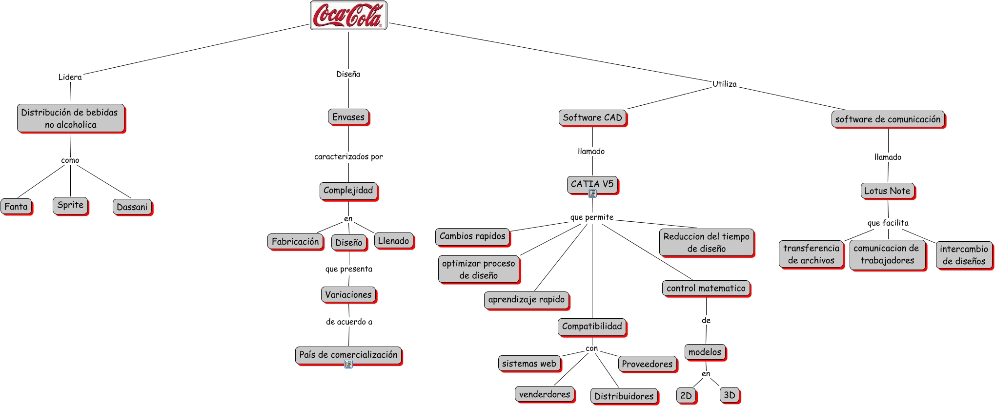 Este Cmap, tiene información relacionada con: COCA-COLA, Utiliza software de comunicación, Diseña Envases, Distribución de bebidas no alcoholica como Dassani, Compatibilidad con Proveedores, Complejidad en Diseño, Utiliza Software CAD, CATIA V5 que permite Cambios rapidos, Lotus Note que facilita comunicacion de trabajadores, Envases caracterizados por Complejidad, Distribución de bebidas no alcoholica como Sprite, control matematico de modelos, control matematico que permite Compatibilidad, Variaciones de acuerdo a País de comercialización, Compatibilidad con sistemas web, control matematico que permite aprendizaje rapido, CATIA V5 que permite Reduccion del tiempo de diseño, software de comunicación llamado Lotus Note, control matematico que permite Cambios rapidos, Software CAD llamado CATIA V5, modelos en 3D