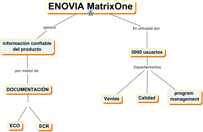 Este Cmap, tiene información relacionada con: F2, información confiable del producto por medio de DOCUMENTACIÓN, ENOVIA MatrixOne genera información confiable del producto, 5000 usuarios Departamentos Ventas, 5000 usuarios Departamentos program management, 5000 usuarios Departamentos Calidad, DOCUMENTACIÓN ECR, DOCUMENTACIÓN ECO, ENOVIA MatrixOne Es utilizada por 5000 usuarios
