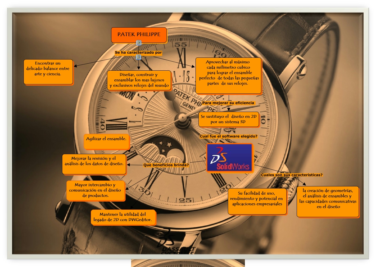This Concept Map, created with IHMC CmapTools, has information related to: PATEK PHILIPPE, Que beneficios brinda? Mejorar la revisión y el análisis de los datos de diseño., PATEK PHILIPPE Se ha caracterizado por Diseñar, construir y ensamblar los mas lujosos y exclusivos relojes del mundo, Que beneficios brinda? Mantener la utilidad del legado de 2D con DWGeditor., PATEK PHILIPPE Se ha caracterizado por Aprovechar al máximo cada milímetro cubico para lograr el ensamble perfecto de todas las pequeñas partes de sus relojes., Que beneficios brinda? Agilizar el ensamble., PATEK PHILIPPE Se ha caracterizado por Encontrar un delicado balance entre arte y ciencia., Se sustituyo el diseño en 2D por un sistema 3D Cual fue el software elegido?, Cuales son sus caracteristicas? Su facilidad de uso, rendimiento y potencial en aplicaciones empresariales, Que beneficios brinda? Mayor intercambio y comunicación en el diseño de productos., Aprovechar al máximo cada milímetro cubico para lograr el ensamble perfecto de todas las pequeñas partes de sus relojes. Para mejorar su eficiencia Se sustituyo el diseño en 2D por un sistema 3D, Cuales son sus caracteristicas? la creación de geometrías, el análisis de ensambles y las capacidades comunicativas en el diseño