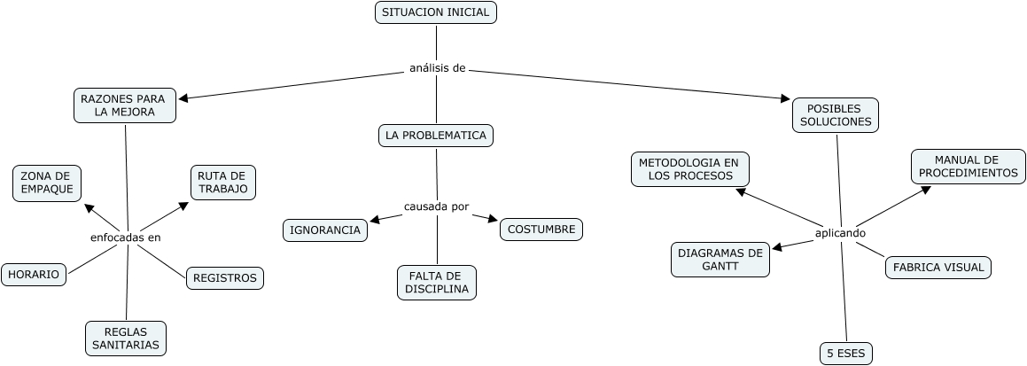 Este Cmap, tiene información relacionada con: situacion inicial, POSIBLES SOLUCIONES aplicando DIAGRAMAS DE GANTT, SITUACION INICIAL análisis de POSIBLES SOLUCIONES, RAZONES PARA LA MEJORA enfocadas en ZONA DE EMPAQUE, SITUACION INICIAL análisis de RAZONES PARA LA MEJORA, RAZONES PARA LA MEJORA enfocadas en REGISTROS, SITUACION INICIAL análisis de LA PROBLEMATICA, POSIBLES SOLUCIONES aplicando FABRICA VISUAL, LA PROBLEMATICA causada por IGNORANCIA, POSIBLES SOLUCIONES aplicando MANUAL DE PROCEDIMIENTOS, POSIBLES SOLUCIONES aplicando 5 ESES, RAZONES PARA LA MEJORA enfocadas en HORARIO, RAZONES PARA LA MEJORA enfocadas en REGLAS SANITARIAS, RAZONES PARA LA MEJORA enfocadas en RUTA DE TRABAJO, LA PROBLEMATICA causada por COSTUMBRE, POSIBLES SOLUCIONES aplicando METODOLOGIA EN LOS PROCESOS, LA PROBLEMATICA causada por FALTA DE DISCIPLINA