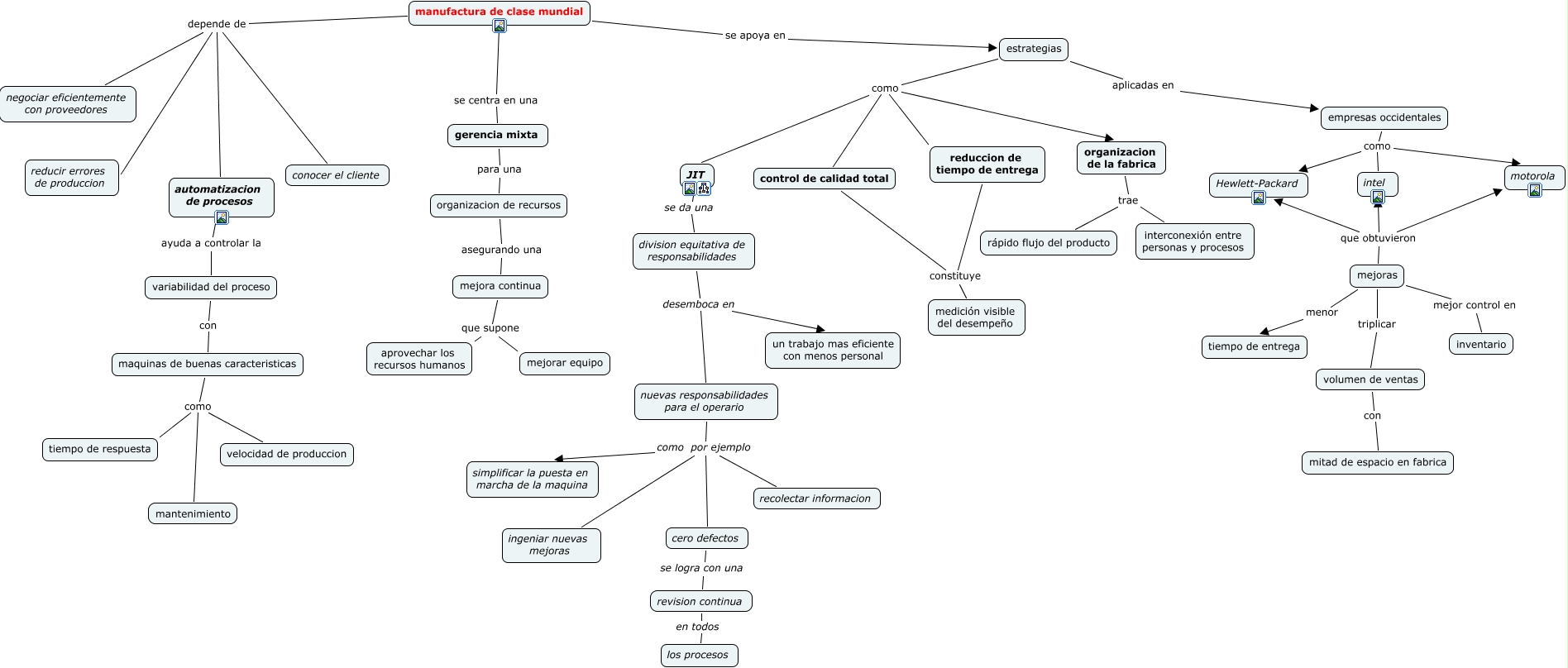 Este Cmap, tiene información relacionada con: manufactura de clase mundial, nuevas responsabilidades para el operario como por ejemplo ingeniar nuevas mejoras, reduccion de tiempo de entrega constituye medición visible del desempeño, estrategias como control de calidad total, variabilidad del proceso con maquinas de buenas caracteristicas, nuevas responsabilidades para el operario como por ejemplo recolectar informacion, mejoras que obtuvieron Hewlett-Packard, division equitativa de responsabilidades desemboca en nuevas responsabilidades para el operario, organizacion de recursos asegurando una mejora continua, estrategias como organizacion de la fabrica, mejoras que obtuvieron intel, maquinas de buenas caracteristicas como mantenimiento, maquinas de buenas caracteristicas como velocidad de produccion, cero defectos se logra con una revision continua, JIT se da una division equitativa de responsabilidades, revision continua en todos los procesos, mejoras menor tiempo de entrega, organizacion de la fabrica trae rápido flujo del producto, manufactura de clase mundial depende de conocer el cliente, mejoras mejor control en inventario, mejora continua que supone mejorar equipo
