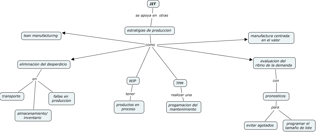 Este Cmap, tiene información relacionada con: JIT(video), estratigias de produccion como manufactura centrada en el valor, TPM realizar una progamacion del mantenimiento, eliminacion del desperdicio en transporte, JIT se apoya en otras estratigias de produccion, eliminacion del desperdicio en almacenamiento/ inventario, estratigias de produccion como lean manufacturing, estratigias de produccion como evaluacion del ritmo de la demanda, pronosticos para programar el tamaño de lote, WIP tener productos en proceso, estratigias de produccion como TPM, pronosticos para evitar agotados, estratigias de produccion como WIP, eliminacion del desperdicio en fallas en produccion, evaluacion del ritmo de la demanda con pronosticos, estratigias de produccion como eliminacion del desperdicio
