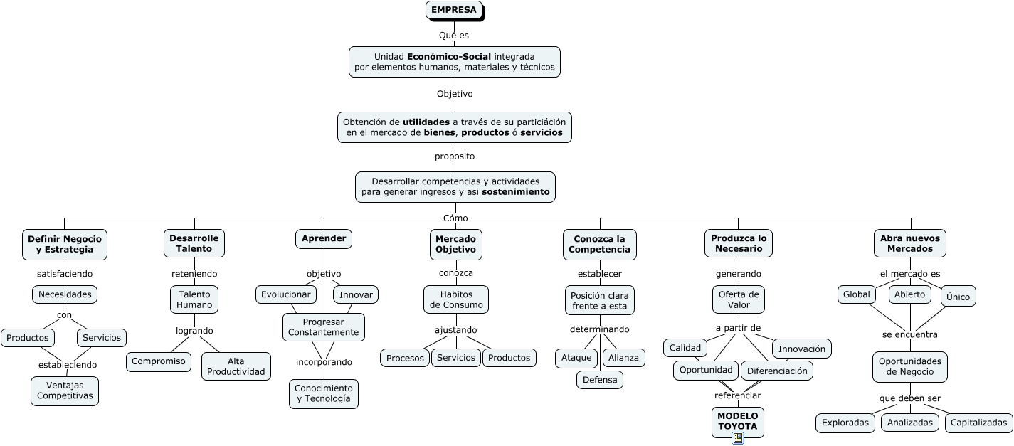 Este Cmap, tiene información relacionada con: Sostenimiento Empresarial, Aprender objetivo Progresar Constantemente, Aprender objetivo Evolucionar, Diferenciación referenciar MODELO TOYOTA, Servicios estableciendo Ventajas Competitivas, Productos estableciendo Ventajas Competitivas, Obtención de utilidades a través de su particiáción en el mercado de bienes, productos ó servicios proposito Desarrollar competencias y actividades para generar ingresos y asi sostenimiento, Talento Humano logrando Compromiso, Posición clara frente a esta determinando Defensa, Abra nuevos Mercados el mercado es Abierto, Habitos de Consumo ajustando Servicios, Oportunidades de Negocio que deben ser Capitalizadas, Necesidades con Productos, Mercado Objetivo conozca Habitos de Consumo, Global se encuentra Oportunidades de Negocio, Desarrollar competencias y actividades para generar ingresos y asi sostenimiento Cómo Abra nuevos Mercados, EMPRESA Qué es Unidad Económico-Social integrada por elementos humanos, materiales y técnicos, Talento Humano logrando Alta Productividad, Oferta de Valor a partir de Innovación, Innovar incorporando Conocimiento y Tecnología, Evolucionar incorporando Conocimiento y Tecnología