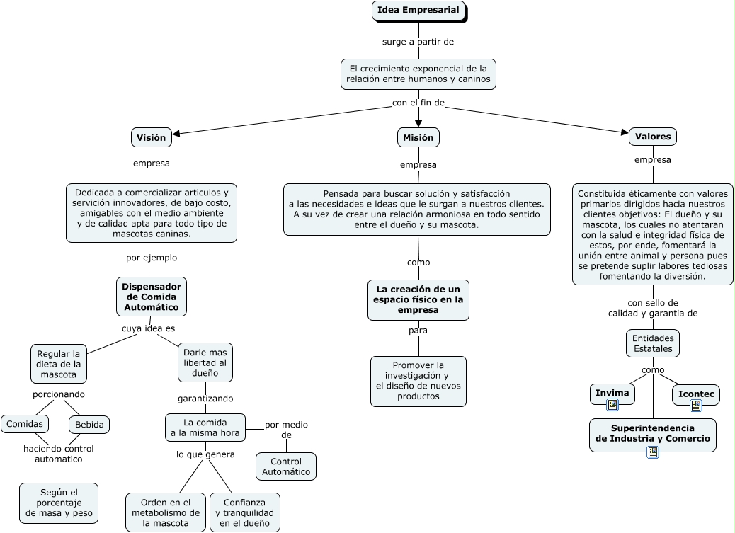 Este Cmap, tiene información relacionada con: Empresa Canina, Comidas haciendo control automatico Según el porcentaje de masa y peso, Darle mas libertad al dueño garantizando La comida a la misma hora, Entidades Estatales como Superintendencia de Industria y Comercio, La comida a la misma hora lo que genera Orden en el metabolismo de la mascota, El crecimiento exponencial de la relación entre humanos y caninos con el fin de Visión, La creación de un espacio físico en la empresa para Atender solictudes y necesidades de nuestros clientes, Idea Empresarial surge a partir de El crecimiento exponencial de la relación entre humanos y caninos, Bebida haciendo control automatico Según el porcentaje de masa y peso, Visión empresa Dedicada a comercializar articulos y servición innovadores, de bajo costo, amigables con el medio ambiente y de calidad apta para todo tipo de mascotas caninas., Regular la dieta de la mascota porcionando Bebida, La creación de un espacio físico en la empresa para Promover la investigación y el diseño de nuevos productos, Entidades Estatales como Icontec, Dispensador de Comida Automático cuya idea es Regular la dieta de la mascota, Regular la dieta de la mascota porcionando Comidas, El crecimiento exponencial de la relación entre humanos y caninos con el fin de Misión, Dedicada a comercializar articulos y servición innovadores, de bajo costo, amigables con el medio ambiente y de calidad apta para todo tipo de mascotas caninas. por ejemplo Dispensador de Comida Automático, La comida a la misma hora lo que genera Confianza y tranquilidad en el dueño, Pensada para buscar solución y satisfacción a las necesidades e ideas que le surgan a nuestros clientes. A su vez de crear una relación armoniosa en todo sentido entre el dueño y su mascota. como La creación de un espacio físico en la empresa, Entidades Estatales como Invima, Misión empresa Pensada para buscar solución y satisfacción a las necesidades e ideas que le surgan a nuestros clientes. A su vez de crear una relación armoniosa en todo sentido entre el dueño y su mascota.