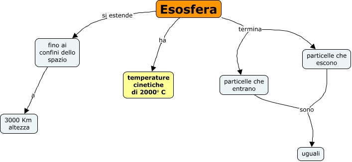 Questa Cmap, creata con IHMC CmapTools, contiene informazioni relative a: 7.07 esosfera, Esosfera ha temperature cinetiche di 2000° C, Esosfera termina particelle che escono, particelle che entrano sono uguali, fino ai confini dello spazio a 3000 Km altezza, Esosfera termina particelle che entrano, Esosfera si estende fino ai confini dello spazio, particelle che escono sono uguali