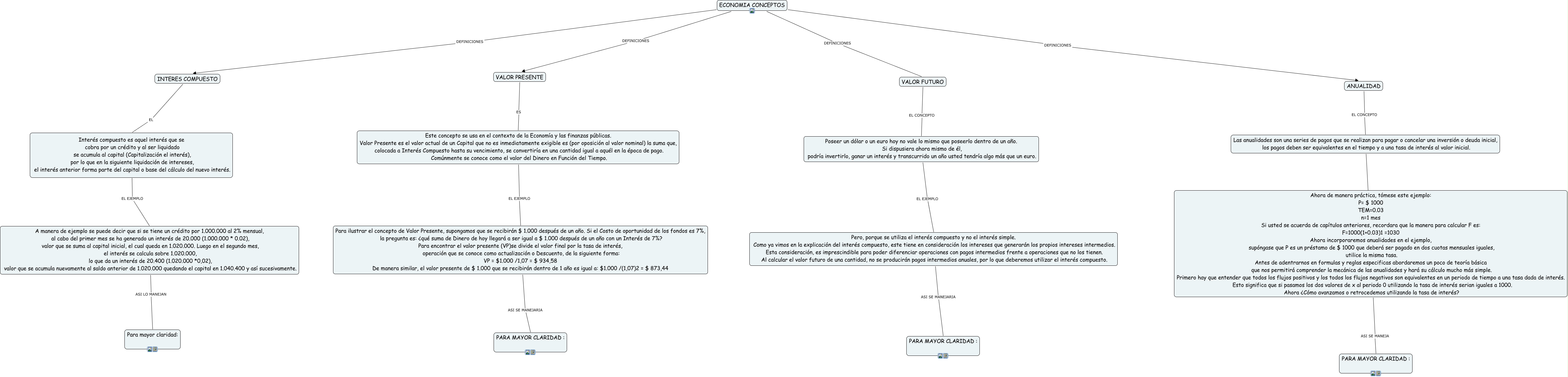 Este Cmap, tiene información relacionada con: actividad N 4 contabilidad y inversion, ECONOMIA CONCEPTOS DEFINICIONES ANUALIDAD, Poseer un dólar o un euro hoy no vale lo mismo que poseerlo dentro de un año. Si dispusiera ahora mismo de él, podría invertirlo, ganar un interés y transcurrido un año usted tendría algo más que un euro. EL EJEMPLO Pero, porque se utiliza el interés compuesto y no el interés simple. Como ya vimos en la explicación del interés compuesto, este tiene en consideración los intereses que generarán los propios intereses intermedios. Esta consideración, es imprescindible para poder diferenciar operaciones con pagos intermedios frente a operaciones que no los tienen. Al calcular el valor futuro de una cantidad, no se producirán pagos intermedios anuales, por lo que deberemos utilizar el interés compuesto., ECONOMIA CONCEPTOS DEFINICIONES VALOR PRESENTE, Interés compuesto es aquel interés que se cobra por un crédito y al ser liquidado se acumula al capital (Capitalización el interés), por lo que en la siguiente liquidación de intereses, el interés anterior forma parte del capital o base del cálculo del nuevo interés. EL EJEMPLO A manera de ejemplo se puede decir que si se tiene un crédito por 1.000.000 al 2% mensual, al cabo del primer mes se ha generado un interés de 20.000 (1.000.000 * 0.02), valor que se suma al capital inicial, el cual queda en 1.020.000. Luego en el segundo mes, el interés se calcula sobre 1.020.000, lo que da un interés de 20.400 (1.020.000 *0,02), valor que se acumula nuevamente al saldo anterior de 1.020.000 quedando el capital en 1.040.400 y así sucesivamente., VALOR PRESENTE ES Este concepto se usa en el contexto de la Economía y las finanzas públicas. Valor Presente es el valor actual de un Capital que no es inmediatamente exigible es (por oposición al valor nominal) la suma que, colocada a Interés Compuesto hasta su vencimiento, se convertiría en una cantidad igual a aquél en la época de pago. Comúnmente se conoce como el valor del Dinero en Función del Tiempo., INTERES COMPUESTO EL Interés compuesto es aquel interés que se cobra por un crédito y al ser liquidado se acumula al capital (Capitalización el interés), por lo que en la siguiente liquidación de intereses, el interés anterior forma parte del capital o base del cálculo del nuevo interés., ECONOMIA CONCEPTOS DEFINICIONES INTERES COMPUESTO, Para ilustrar el concepto de Valor Presente, supongamos que se recibirán $ 1.000 después de un año. Si el Costo de oportunidad de los fondos es 7%, la pregunta es: ¿qué suma de Dinero de hoy llegará a ser igual a $ 1.000 después de un año con un Interés de 7%? Para encontrar el valor presente (VP)se divide el valor final por la tasa de interés, operación que se conoce como actualización o Descuento, de la siguiente forma: VP = $1.000 /1,07 = $ 934,58 De manera similar, el valor presente de $ 1.000 que se recibirán dentro de 1 año es igual a: $1.000 /(1,07)2 = $ 873,44 ASI SE MANEJARIA PARA MAYOR CLARIDAD :, Ahora de manera práctica, tómese este ejemplo: P= $ 1000 TEM=0.03 n=1 mes Si usted se acuerda de capítulos anteriores, recordara que la manera para calcular F es: F=1000(1+0.03)1 =1030 Ahora incorporaremos anualidades en el ejemplo, supóngase que P es un préstamo de $ 1000 que deberá ser pagado en dos cuotas mensuales iguales, utilice la misma tasa. Antes de adentrarnos en formulas y reglas especificas abordaremos un poco de teoría básica que nos permitirá comprender la mecánica de las anualidades y hará su cálculo mucho más simple. Primero hay que entender que todos los flujos positivos y los todos los flujos negativos son equivalentes en un periodo de tiempo a una tasa dada de interés. Esto significa que si pasamos los dos valores de x al periodo 0 utilizando la tasa de interés serian iguales a 1000. Ahora ¿Cómo avanzamos o retrocedemos utilizando la tasa de interés? ASI SE MANEJA PARA MAYOR CLARIDAD :, Este concepto se usa en el contexto de la Economía y las finanzas públicas. Valor Presente es el valor actual de un Capital que no es inmediatamente exigible es (por oposición al valor nominal) la suma que, colocada a Interés Compuesto hasta su vencimiento, se convertiría en una cantidad igual a aquél en la época de pago. Comúnmente se conoce como el valor del Dinero en Función del Tiempo. EL EJEMPLO Para ilustrar el concepto de Valor Presente, supongamos que se recibirán $ 1.000 después de un año. Si el Costo de oportunidad de los fondos es 7%, la pregunta es: ¿qué suma de Dinero de hoy llegará a ser igual a $ 1.000 después de un año con un Interés de 7%? Para encontrar el valor presente (VP)se divide el valor final por la tasa de interés, operación que se conoce como actualización o Descuento, de la siguiente forma: VP = $1.000 /1,07 = $ 934,58 De manera similar, el valor presente de $ 1.000 que se recibirán dentro de 1 año es igual a: $1.000 /(1,07)2 = $ 873,44, ANUALIDAD EL CONCEPTO Las anualidades son una series de pagos que se realizan para pagar o cancelar una inversión o deuda inicial, los pagos deben ser equivalentes en el tiempo y a una tasa de interés al valor inicial., ECONOMIA CONCEPTOS DEFINICIONES VALOR FUTURO, A manera de ejemplo se puede decir que si se tiene un crédito por 1.000.000 al 2% mensual, al cabo del primer mes se ha generado un interés de 20.000 (1.000.000 * 0.02), valor que se suma al capital inicial, el cual queda en 1.020.000. Luego en el segundo mes, el interés se calcula sobre 1.020.000, lo que da un interés de 20.400 (1.020.000 *0,02), valor que se acumula nuevamente al saldo anterior de 1.020.000 quedando el capital en 1.040.400 y así sucesivamente. ASI LO MANEJAN Para mayor claridad:, Las anualidades son una series de pagos que se realizan para pagar o cancelar una inversión o deuda inicial, los pagos deben ser equivalentes en el tiempo y a una tasa de interés al valor inicial. EL EJEMPLO Ahora de 