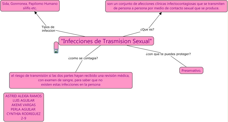 Este Cmap, tiene información relacionada con: TRABAJO EN EQUIPO 2-9, "Infecciones de Trasmision Sexual" ¿como se contagia? el riesgo de transmisión si las dos partes hayan recibido una revisión médica, con examen de sangre, para saber que no existen estas infecciones en la persona, "Infecciones de Trasmision Sexual" ¿con que te puedes proteger? Preservativo., "Infecciones de Trasmision Sexual" Tipos de infeccion Sida, Gonrronea, Papilomo Humano silifis etc., "Infecciones de Trasmision Sexual" ¿Que es? son un conjunto de afecciones clínicas infectocontagiosas que se transmiten de persona a persona por medio de contacto sexual que se produce.