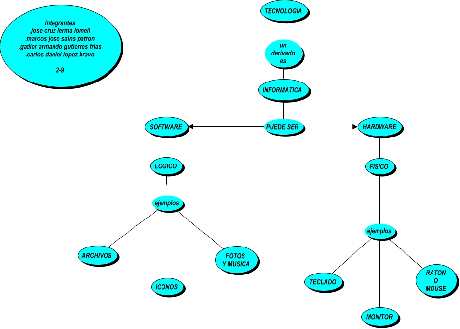 Este Cmap, tiene información relacionada con: trabajo en equipo tecnologia, SOFTWARE ejemplos ARCHIVOS, TECNOLOGIA un derivado es INFORMATICA, HARDWARE ejemplos TECLADO, SOFTWARE ejemplos FOTOS Y MUSICA, INFORMATICA PUEDE SER HARDWARE, INFORMATICA PUEDE SER SOFTWARE, HARDWARE ejemplos RATON O MOUSE, HARDWARE ejemplos MONITOR, SOFTWARE ejemplos ICONOS