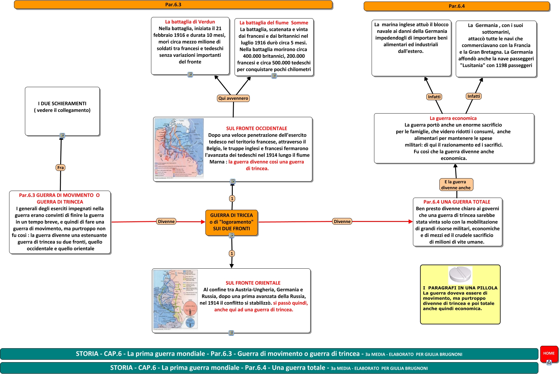Questa Cmap, creata con IHMC CmapTools, contiene informazioni relative a: STORIA - Par.6.3 - Guerra di movimento e guerra di trincea - Par.6.4 - Una guerra totale - GB 3a media, Par.6.3 GUERRA DI MOVIMENTO O GUERRA DI TRINCEA I generali degli eserciti impegnati nella guerra erano convinti di finire la guerra in un tempo breve, e quindi di fare una guerra di movimento, ma purtroppo non fu così : la guerra divenne una estenuante guerra di trincea su due fronti, quello occidentale e quello orientale Fra I DUE SCHIERAMENTI ( vedere il collegamento), GUERRA DI TRICEA o di "logoramento" SUI DUE FRONTI 1 SUL FRONTE OCCIDENTALE Dopo una veloce penetrazione dell'esercito tedesco nel teritorio francese, attraverso il Belgio, le truppe inglesi e francesi fermarono l'avanzata dei tedeschi nel 1914 lungo il fiume Marna : la guerra divenne così una guerra di trincea., La guerra economica La guerra portò anche un enorme sacrificio per le famiglie, che videro ridotti i consumi, anche alimentari per mantenere le spese militari: di qui il razionamento ed i sacrifici. Fu così che la guerra divenne anche economica. Infatti La marina inglese attuò il blocco navale ai danni della Germania impedendogli di importare beni alimentari ed industriali dall'estero., SUL FRONTE OCCIDENTALE Dopo una veloce penetrazione dell'esercito tedesco nel teritorio francese, attraverso il Belgio, le truppe inglesi e francesi fermarono l'avanzata dei tedeschi nel 1914 lungo il fiume Marna : la guerra divenne così una guerra di trincea. Qui avvennero La battaglia di Verdun Nella battaglia, iniziata il 21 febbraio 1916 e durata 10 mesi, morì circa mezzo milione di soldati tra francesi e tedeschi senza variazioni importanti del fronte, GUERRA DI TRICEA o di "logoramento" SUI DUE FRONTI Divenne Par.6.4 UNA GUERRA TOTALE Ben presto divenne chiaro ai governi che una guerra di trincea sarebbe stata vinta solo con la mobilitazione di grandi risorse militari, economiche e di mezzi ed il crudele sacrificio di milioni di vite umane., Par.6.3 GUERRA DI MOVIMENTO O GUERRA DI TRINCEA I generali degli eserciti impegnati nella guerra erano convinti di finire la guerra in un tempo breve, e quindi di fare una guerra di movimento, ma purtroppo non fu così : la guerra divenne una estenuante guerra di trincea su due fronti, quello occidentale e quello orientale Divenne GUERRA DI TRICEA o di "logoramento" SUI DUE FRONTI, La guerra economica La guerra portò anche un enorme sacrificio per le famiglie, che videro ridotti i consumi, anche alimentari per mantenere le spese militari: di qui il razionamento ed i sacrifici. Fu così che la guerra divenne anche economica. Infatti La Germania , con i suoi sottomarini, attaccò tutte le navi che commerciavano con la Francia e la Gran Bretagna. La Germania affondò anche la nave passeggeri "Lusitania" con 1198 passeggeri, Par.6.4 UNA GUERRA TOTALE Ben presto divenne chiaro ai governi che una guerra di trincea sarebbe stata vinta solo con la mobilitazione di grandi risorse militari, economiche e di mezzi ed il crudele sacrificio di milioni di vite umane. E la guerra divenne anche La guerra economica La guerra portò anche un enorme sacrificio per le famiglie, che videro ridotti i consumi, anche alimentari per mantenere le spese militari: di qui il razionamento ed i sacrifici. Fu così che la guerra divenne anche economica., GUERRA DI TRICEA o di "logoramento" SUI DUE FRONTI 1 SUL FRONTE ORIENTALE Al confine tra Austria-Ungheria, Germania e Russia, dopo una prima avanzata della Russia, nel 1914 il conflitto si stabilizzò. si passò quindi, anche qui ad una guerra di trincea., SUL FRONTE OCCIDENTALE Dopo una veloce penetrazione dell'esercito tedesco nel teritorio francese, attraverso il Belgio, le truppe inglesi e francesi fermarono l'avanzata dei tedeschi nel 1914 lungo il fiume Marna : la guerra divenne così una guerra di trincea. Qui avvennero La battaglia del fiume Somme La battaglia, scatenata e vinta dai francesi e dai britannici nel luglio 1916 durò circa 5 mesi. Nella battaglia morirono circa 400.000 britannici, 200.000 francesi e circa 500.000 tedeschi per conquistare pochi chilometri