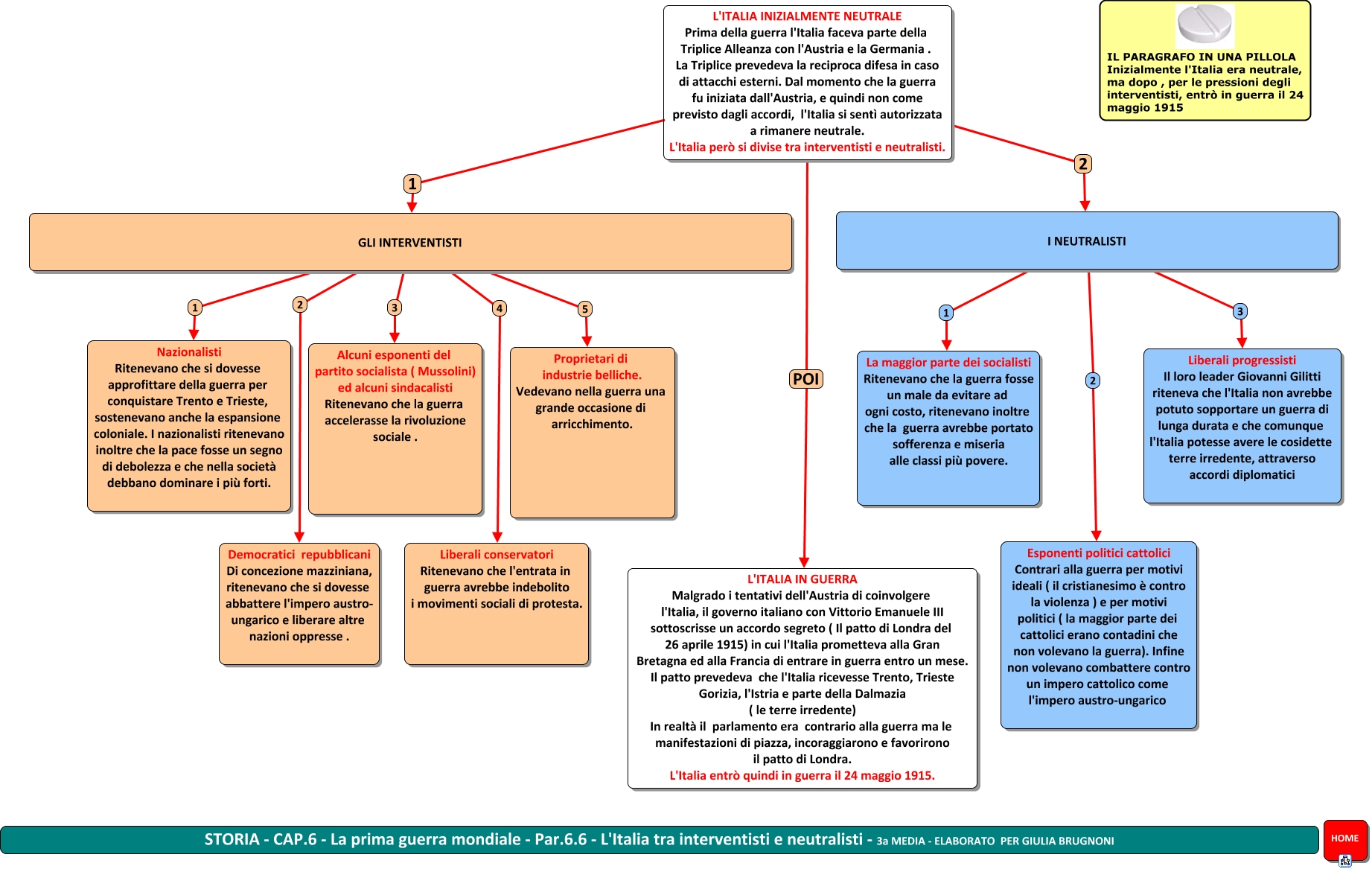 Questa Cmap, creata con IHMC CmapTools, contiene informazioni relative a: STORIA - Par.6.6 - L'iatalia tra interventisti e neutralisti - GB 3a media, GLI INTERVENTISTI 4 Liberali conservatori Ritenevano che l'entrata in guerra avrebbe indebolito i movimenti sociali di protesta., I NEUTRALISTI 3 Liberali progressisti Il loro leader Giovanni Gilitti riteneva che l'Italia non avrebbe potuto sopportare un guerra di lunga durata e che comunque l'Italia potesse avere le cosidette terre irredente, attraverso accordi diplomatici, L'ITALIA INIZIALMENTE NEUTRALE Prima della guerra l'Italia faceva parte della Triplice Alleanza con l'Austria e la Germania . La Triplice prevedeva la reciproca difesa in caso di attacchi esterni. Dal momento che la guerra fu iniziata dall'Austria, e quindi non come previsto dagli accordi, l'Italia si sentì autorizzata a rimanere neutrale. L'Italia però si divise tra interventisti e neutralisti. 1 GLI INTERVENTISTI, I NEUTRALISTI 2 Esponenti politici cattolici Contrari alla guerra per motivi ideali ( il cristianesimo è contro la violenza ) e per motivi politici ( la maggior parte dei cattolici erano contadini che non volevano la guerra). Infine non volevano combattere contro un impero cattolico come l'impero austro-ungarico, I NEUTRALISTI 1 La maggior parte dei socialisti Ritenevano che la guerra fosse un male da evitare ad ogni costo, ritenevano inoltre che la guerra avrebbe portato sofferenza e miseria alle classi più povere., GLI INTERVENTISTI 1 Nazionalisti Ritenevano che si dovesse approfittare della guerra per conquistare Trento e Trieste, sostenevano anche la espansione coloniale. I nazionalisti ritenevano inoltre che la pace fosse un segno di debolezza e che nella società debbano dominare i più forti., GLI INTERVENTISTI 5 Proprietari di industrie belliche. Vedevano nella guerra una grande occasione di arricchimento., L'ITALIA INIZIALMENTE NEUTRALE Prima della guerra l'Italia faceva parte della Triplice Alleanza con l'Austria e la Germania . La Triplice prevedeva la reciproca difesa in caso di attacchi esterni. Dal momento che la guerra fu iniziata dall'Austria, e quindi non come previsto dagli accordi, l'Italia si sentì autorizzata a rimanere neutrale. L'Italia però si divise tra interventisti e neutralisti. 2 I NEUTRALISTI, L'ITALIA INIZIALMENTE NEUTRALE Prima della guerra l'Italia faceva parte della Triplice Alleanza con l'Austria e la Germania . La Triplice prevedeva la reciproca difesa in caso di attacchi esterni. Dal momento che la guerra fu iniziata dall'Austria, e quindi non come previsto dagli accordi, l'Italia si sentì autorizzata a rimanere neutrale. L'Italia però si divise tra interventisti e neutralisti. POI L'ITALIA IN GUERRA Malgrado i tentativi dell'Austria di coinvolgere l'Italia, il governo italiano con Vittorio Emanuele III sottoscrisse un accordo segreto ( Il patto di Londra del 26 aprile 1915) in cui l'Italia prometteva alla Gran Bretagna ed alla Francia di entrare in guerra entro un mese. Il patto prevedeva che l'Italia ricevesse Trento, Trieste Gorizia, l'Istria e parte della Dalmazia ( le terre irredente) In realtà il parlamento era contrario alla guerra ma le manifestazioni di piazza, incoraggiarono e favorirono il patto di Londra. L'Italia entrò quindi in guerra il 24 maggio 1915., GLI INTERVENTISTI 2 Democratici repubblicani Di concezione mazziniana, ritenevano che si dovesse abbattere l'impero austro- ungarico e liberare altre nazioni oppresse ., GLI INTERVENTISTI 3 Alcuni esponenti del partito socialista ( Mussolini) ed alcuni sindacalisti Ritenevano che la guerra accelerasse la rivoluzione sociale .