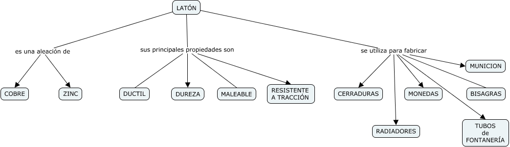 Este Cmap, tiene información relacionada con: LATÓN, LATÓN se utiliza para fabricar CERRADURAS, LATÓN sus principales propiedades son DUREZA, LATÓN es una aleación de COBRE, LATÓN se utiliza para fabricar TUBOS de FONTANERÍA, LATÓN sus principales propiedades son MALEABLE, LATÓN sus principales propiedades son RESISTENTE A TRACCIÓN, LATÓN se utiliza para fabricar BISAGRAS, LATÓN sus principales propiedades son DUCTIL, LATÓN se utiliza para fabricar MONEDAS, LATÓN se utiliza para fabricar MUNICION, LATÓN es una aleación de ZINC, LATÓN se utiliza para fabricar RADIADORES