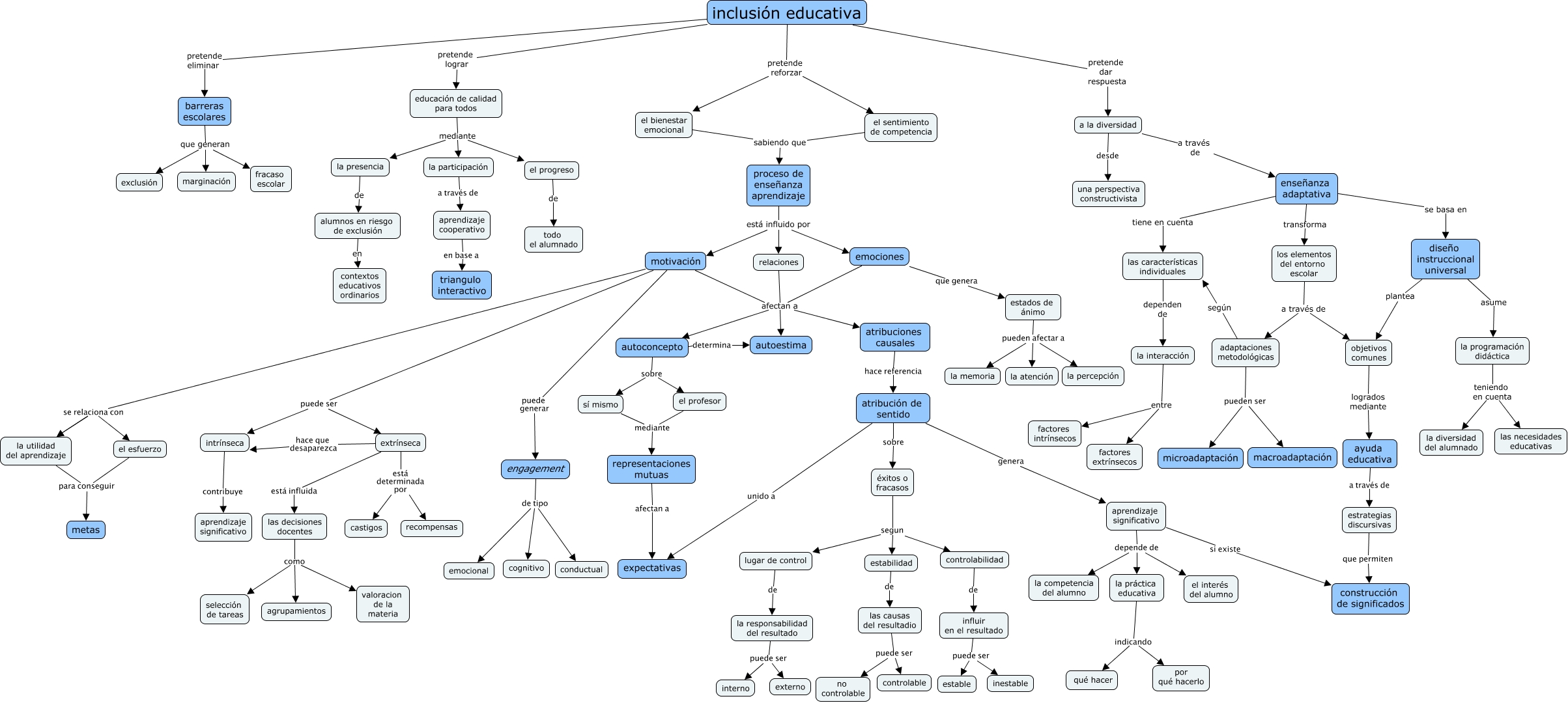 Este Cmap, tiene información relacionada con: PEC 1 procesos afectivos y emocionales, inclusión educativa pretende dar respuesta a la diversidad, atribución de sentido sobre éxitos o fracasos, motivación afectan a autoestima, diseño instruccional universal asume la programación didáctica, el profesor mediante representaciones mutuas, motivación puede ser extrínseca, relaciones afectan a atribuciones causales, a la diversidad desde una perspectiva constructivista, las características individuales dependen de la interacción, estabilidad de las causas del resultadio, la programación didáctica teniendo en cuenta las necesidades educativas, la responsabilidad del resultado puede ser interno, proceso de enseñanza aprendizaje está influido por relaciones, lugar de control de la responsabilidad del resultado, estados de ánimo pueden afectar a la memoria, estados de ánimo pueden afectar a la percepción, autoconcepto sobre el profesor, sí mismo mediante representaciones mutuas, éxitos o fracasos segun controlabilidad, enseñanza adaptativa se basa en diseño instruccional universal