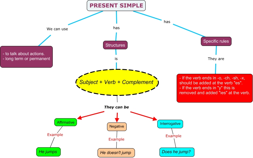 Este Cmap, tiene información relacionada con: PRESENT SIMPLE, Subject + Verb + Complement They can be Affirmative, Specific rules They are - If the verb ends in -o, -ch, -sh, -x, should be added at the verb "es". - If the verb ends in "y" this is removed and added "ies" at the verb., Interrogative Example Does he jump?, Subject + Verb + Complement They can be Interrogative, Subject + Verb + Complement They can be Negative, Structures is Subject + Verb + Complement, PRESENT SIMPLE We can use - to talk about actions. - long term or permanent, PRESENT SIMPLE has Structures, PRESENT SIMPLE has Specific rules, Affirmative Example He jumps, Negative Example He doesn't jump