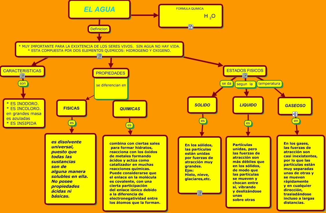 Este Cmap, tiene información relacionada con: AGUA, ESTADOS FISICOS segun la LIQUIDO, * MUY IMPORTANTE PARA LA EXIXTENCIA DE LOS SERES VIVOS. SIN AGUA NO HAY VIDA. * ESTA COMPUESTA POR DOS ELEMENTOS QUIMICOS: HIDROGENO Y OXIGENO. ???? ESTADOS FISICOS, CARACTERISTICAS son * ES INODORO. * ES INCOLORO. en grandes masa es azuladas * ES INSIPIDA, ESTADOS FISICOS se da SOLIDO, EL AGUA Definicion * MUY IMPORTANTE PARA LA EXIXTENCIA DE LOS SERES VIVOS. SIN AGUA NO HAY VIDA. * ESTA COMPUESTA POR DOS ELEMENTOS QUIMICOS: HIDROGENO Y OXIGENO., PROPIEDADES se diferencian en FISICAS, EL AGUA ???? <math xmlns="http://www.w3.org/1998/Math/MathML"> <mrow> <mtext> FORMULA QUIMICA