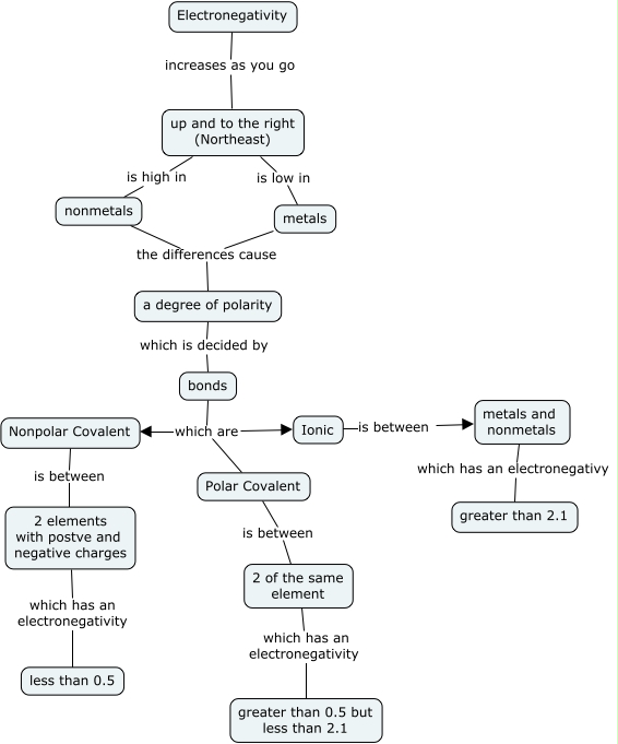 This Concept Map, created with IHMC CmapTools, has information related to: Electronegativity, Ionic is between metals and nonmetals, Polar Covalent is between 2 of the same element, metals and nonmetals which has an electronegativy greater than 2.1, 2 of the same element which has an electronegativity greater than 0.5 but less than 2.1, a degree of polarity which is decided by bonds, 2 elements with postve and negative charges which has an electronegativity less than 0.5, bonds which are Polar Covalent, metals the differences cause a degree of polarity, bonds which are Nonpolar Covalent, nonmetals the differences cause a degree of polarity, Electronegativity increases as you go up and to the right (Northeast), up and to the right (Northeast) is high in nonmetals, bonds which are Ionic, Nonpolar Covalent is between 2 elements with postve and negative charges, up and to the right (Northeast) is low in metals