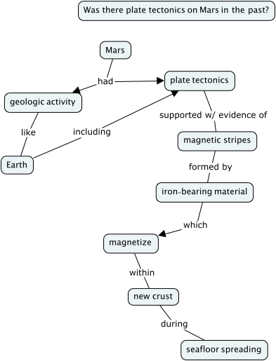 This Concept Map, created with IHMC CmapTools, has information related to: Plate Tectonic Mars, Mars had geologic activity, magnetic stripes formed by iron-bearing material, Earth including plate tectonics, new crust during seafloor spreading, Mars had plate tectonics, plate tectonics supported w/ evidence of magnetic stripes, magnetize within new crust, iron-bearing material which magnetize, geologic activity like Earth