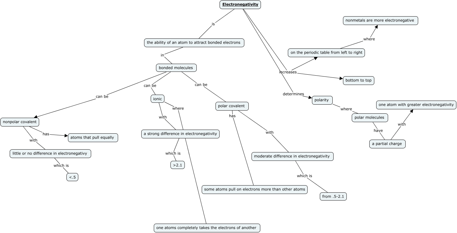 This Concept Map, created with IHMC CmapTools, has information related to: Electronegativity, nonpolar covalent has atoms that pull equally, little or no difference in electronegativy which is <.5, polarity where polar molecules, polar covalent with moderate difference in electronegativity, bonded molecules can be polar covalent, Electronegativity increases bottom to top, ionic with a strong difference in electronegativity, a partial charge with one atom with greater electronegativity, a strong difference in electronegativity which is ɮ.1, Electronegativity is the ability of an atom to attract bonded electrons, bonded molecules can be nonpolar covalent, Electronegativity increases on the periodic table from left to right, on the periodic table from left to right where nonmetals are more electronegative, polar molecules have a partial charge, nonpolar covalent with little or no difference in electronegativy, bonded molecules can be ionic, the ability of an atom to attract bonded electrons in bonded molecules, ionic where one atoms completely takes the electrons of another, polar covalent has some atoms pull on electrons more than other atoms, moderate difference in electronegativity which is from .5-2.1