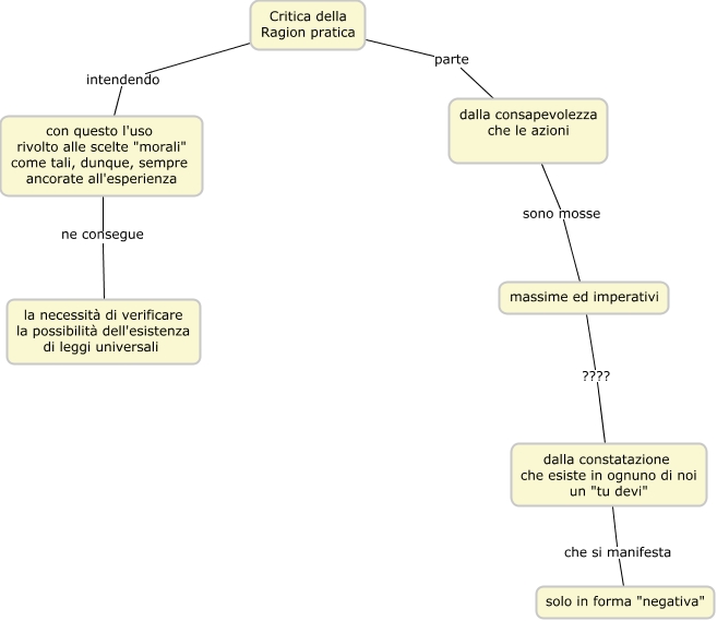 Questa Cmap, creata con IHMC CmapTools, contiene informazioni relative a: Critica Della Ragion Pratica, dalla constatazione che esiste in ognuno di noi un "tu devi" che si manifesta solo in forma "negativa", Critica della Ragion pratica intendendo con questo l'uso rivolto alle scelte "morali" come tali, dunque, sempre ancorate all'esperienza, dalla consapevolezza che le azioni sono mosse massime ed imperativi, con questo l'uso rivolto alle scelte "morali" come tali, dunque, sempre ancorate all'esperienza ne consegue la necessità di verificare la possibilità dell'esistenza di leggi universali, massime ed imperativi ???? dalla constatazione che esiste in ognuno di noi un "tu devi", Critica della Ragion pratica parte dalla consapevolezza che le azioni