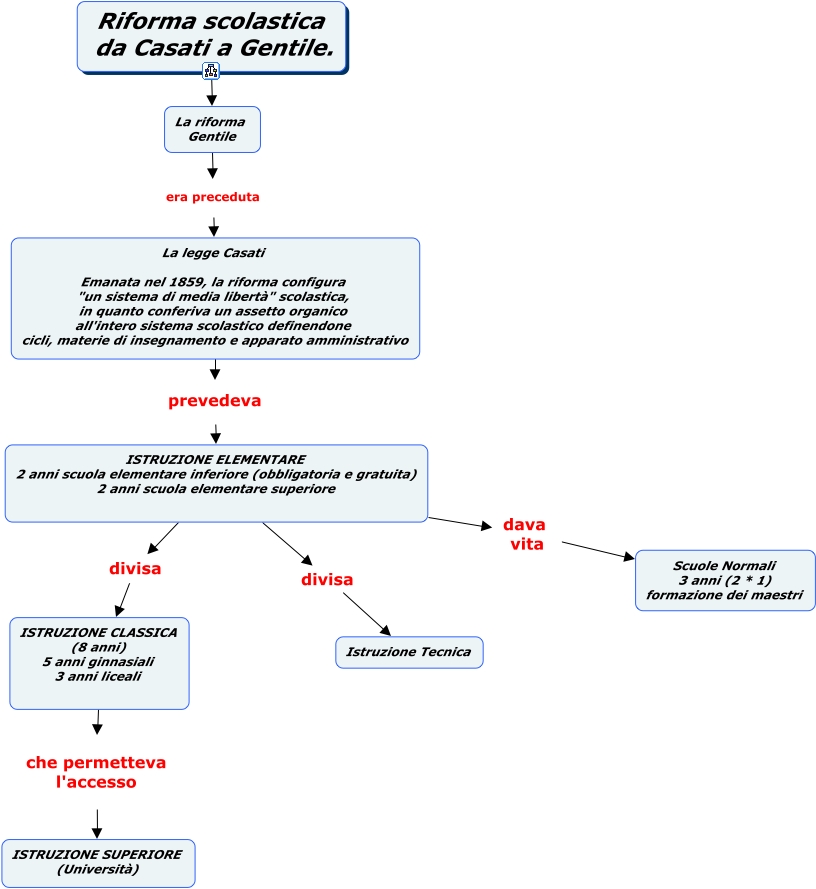 Questa Cmap, creata con IHMC CmapTools, contiene informazioni relative a: Riforma scolastica da Casati a Gentile, ISTRUZIONE ELEMENTARE 2 anni scuola elementare inferiore (obbligatoria e gratuita) 2 anni scuola elementare superiore divisa Istruzione Tecnica, La riforma Gentile era preceduta La legge Casati Emanata nel 1859, la riforma configura "un sistema di media libertà" scolastica, in quanto conferiva un assetto organico all'intero sistema scolastico definendone cicli, materie di insegnamento e apparato amministrativo, ISTRUZIONE CLASSICA (8 anni) 5 anni ginnasiali 3 anni liceali che permetteva l'accesso ISTRUZIONE SUPERIORE (Università), La legge Casati Emanata nel 1859, la riforma configura "un sistema di media libertà" scolastica, in quanto conferiva un assetto organico all'intero sistema scolastico definendone cicli, materie di insegnamento e apparato amministrativo prevedeva ISTRUZIONE ELEMENTARE 2 anni scuola elementare inferiore (obbligatoria e gratuita) 2 anni scuola elementare superiore, ISTRUZIONE ELEMENTARE 2 anni scuola elementare inferiore (obbligatoria e gratuita) 2 anni scuola elementare superiore divisa ISTRUZIONE CLASSICA (8 anni) 5 anni ginnasiali 3 anni liceali, Riforma scolastica da Casati a Gentile. La riforma Gentile, ISTRUZIONE ELEMENTARE 2 anni scuola elementare inferiore (obbligatoria e gratuita) 2 anni scuola elementare superiore dava vita Scuole Normali 3 anni (2 * 1) formazione dei maestri