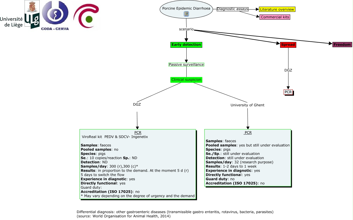 This Concept Map, created with IHMC CmapTools, has information related to: Porcine Epidemic Diarrhoea VF, Early detection Passive surveillance Clinical suspicion, Spread DGZ PCR, Porcine Epidemic Diarrhoea scenario Spread, DGZ ???? PCR ViroReal kit PEDV & SDCV- Ingenetix Samples: faeces Pooled samples: no Species: pigs Se.: 10 copies/reaction Sp.: ND Detection: ND Samples/day: 300 (r),300 (c)* Results: in proportion to the demand. At the moment 5 d (r) 5 days to switch the flow Experience in diagnotic: yes Directly functional: yes Guard duty: Accreditation (ISO 17025): no * May vary depending on the degree of urgency and the demand, Clinical suspicion ???? University of Ghent, Porcine Epidemic Diarrhoea Diagnostic assays Commercial kits, Porcine Epidemic Diarrhoea scenario Early detection, Clinical suspicion ???? DGZ, Porcine Epidemic Diarrhoea scenario Freedom, Porcine Epidemic Diarrhoea Diagnostic assays Literature overview, University of Ghent ???? PCR Samples: faeces Pooled samples: yes but still under evaluation Species: pigs Se./Sp.: still under evaluation Detection: still under evaluation Samples/day: 32 (research purpose) Results: 1-2 days to 1 week Experience in diagnotic: yes Directly functional: yes Guard duty: no Accreditation (ISO 17025): no