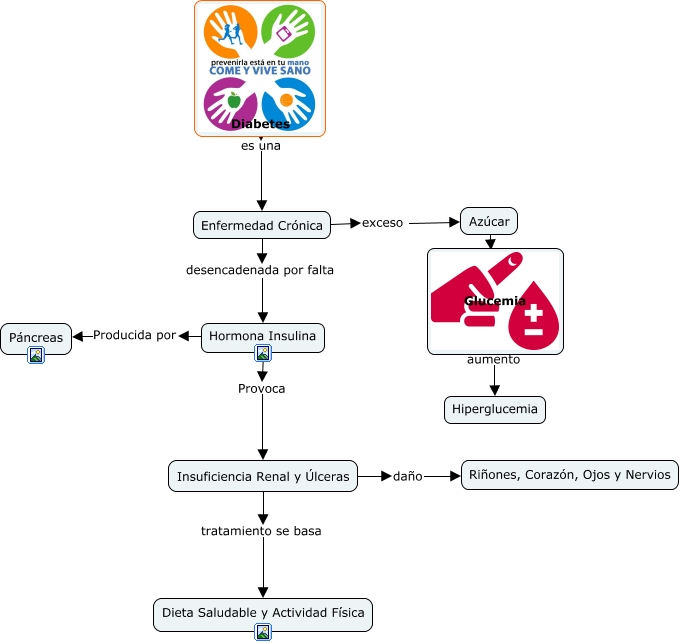 Este Cmap, tiene información relacionada con: Cmaps Diabetes, Diabetes es una Enfermedad Crónica, Glucemia aumento Hiperglucemia, Enfermedad Crónica exceso Azúcar, Azúcar su nivel en sangre Glucemia, Insuficiencia Renal y Úlceras tratamiento se basa Dieta Saludable y Actividad Física, Hormona Insulina Provoca Insuficiencia Renal y Úlceras, Insuficiencia Renal y Úlceras daño Riñones, Corazón, Ojos y Nervios, Hormona Insulina Producida por Páncreas, Enfermedad Crónica desencadenada por falta Hormona Insulina