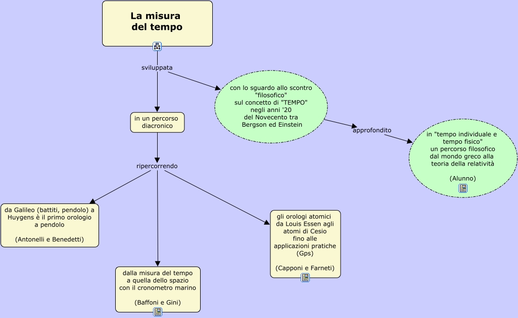 Questa Cmap, creata con IHMC CmapTools, contiene informazioni relative a: Storia Del Tempo, Degli Orologi E Dello Spazio, con lo sguardo allo scontro "filosofico" sul concetto di "TEMPO" negli anni '20 del Novecento tra Bergson ed Einstein approfondito in "tempo individuale e tempo fisico" un percorso filosofico dal mondo greco alla teoria della relatività (Alunno), La misura del tempo sviluppata in un percorso diacronico, La misura del tempo sviluppata con lo sguardo allo scontro "filosofico" sul concetto di "TEMPO" negli anni '20 del Novecento tra Bergson ed Einstein, in un percorso diacronico ripercorrendo dalla misura del tempo a quella dello spazio con il cronometro marino (Baffoni e Gini), in un percorso diacronico ripercorrendo da Galileo (battiti, pendolo) a Huygens è il primo orologio a pendolo (Antonelli e Benedetti), in un percorso diacronico ripercorrendo gli orologi atomici da Louis Essen agli atomi di Cesio fino alle applicazioni pratiche (Gps) (Capponi e Farneti)