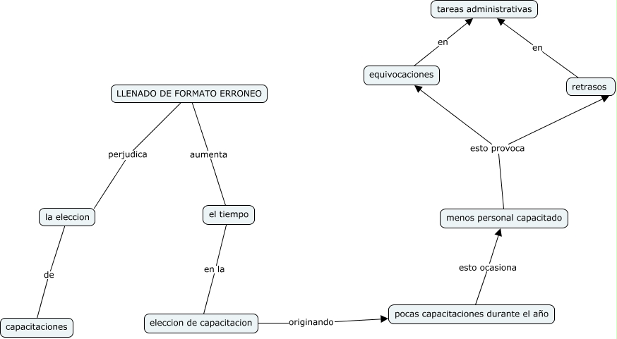 Este Cmap, tiene información relacionada con: Lllenado de formato erroneo, LLENADO DE FORMATO ERRONEO perjudica la eleccion, LLENADO DE FORMATO ERRONEO aumenta el tiempo, equivocaciones en tareas administrativas, retrasos en tareas administrativas, el tiempo en la eleccion de capacitacion, la eleccion de capacitaciones, menos personal capacitado esto provoca equivocaciones, menos personal capacitado esto provoca retrasos, eleccion de capacitacion originando pocas capacitaciones durante el año, pocas capacitaciones durante el año esto ocasiona menos personal capacitado