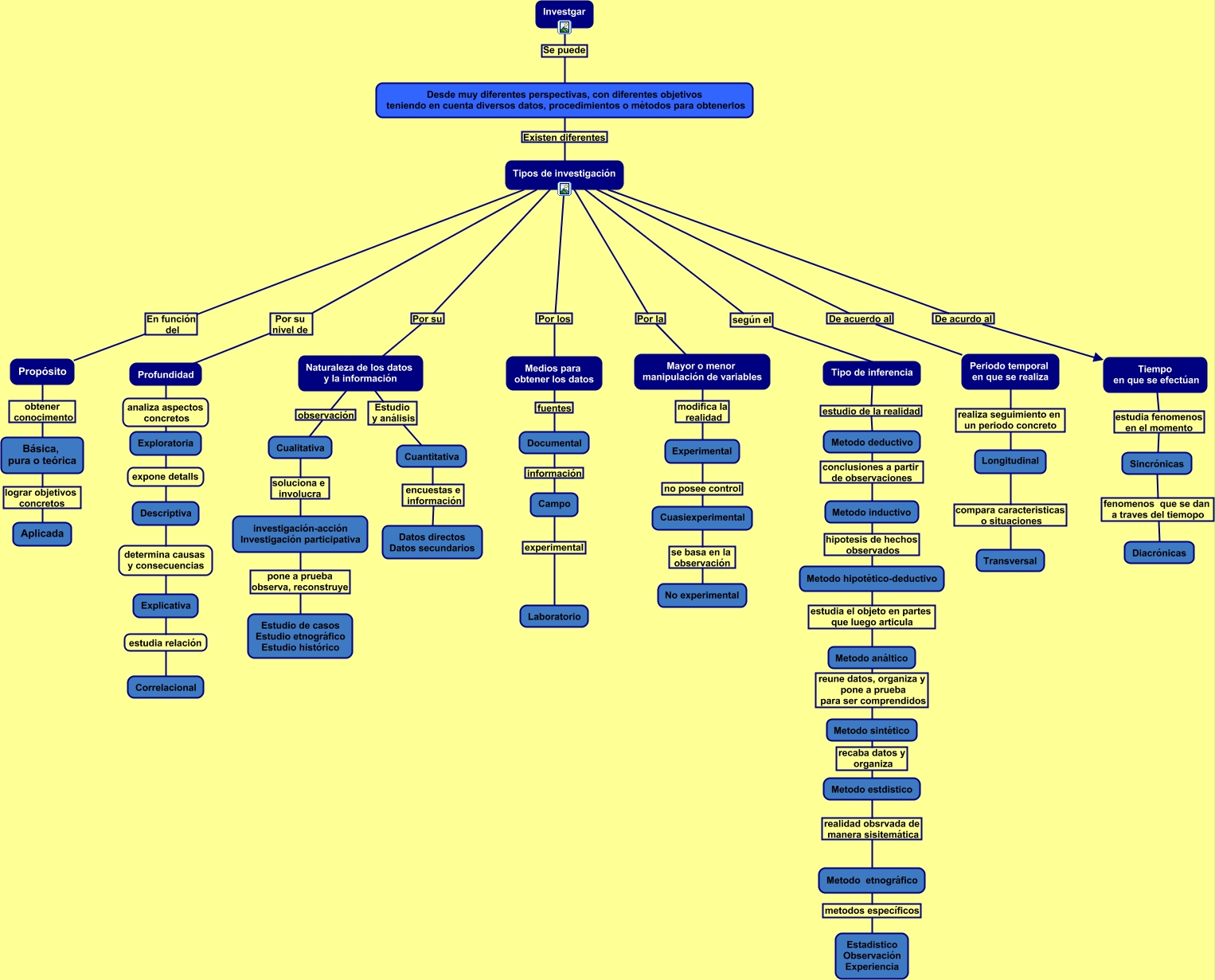 Este Cmap, tiene información relacionada con: Tipos de investigación, Sincrónicas fenomenos que se dan a traves del tiemopo Diacrónicas, Documental información Campo, Periodo temporal en que se realiza realiza seguimiento en un periodo concreto Longitudinal, Longitudinal compara caracteristicas o situaciones Transversal, Naturaleza de los datos y la información observación Cualitativa, Desde muy diferentes perspectivas, con diferentes objetivos teniendo en cuenta diversos datos, procedimientos o métodos para obtenerlos Existen diferentes Tipos de investigación, Tipos de investigación De acurdo al Tiempo en que se efectúan, Cuasiexperimental se basa en la observación No experimental, Experimental no posee control Cuasiexperimental, Metodo hipotético-deductivo estudia el objeto en partes que luego articula Metodo análtico, Metodo deductivo conclusiones a partir de observaciones Metodo inductivo, Metodo inductivo hipotesis de hechos observados Metodo hipotético-deductivo, Cuantitativa encuestas e información Datos directos Datos secundarios, Medios para obtener los datos fuentes Documental, Tipos de investigación De acuerdo al Periodo temporal en que se realiza, Básica, pura o teórica lograr objetivos concretos Aplicada, Metodo análtico reune datos, organiza y pone a prueba para ser comprendidos Metodo sintético, Descriptiva determina causas y consecuencias Explicativa, Cualitativa soluciona e involucra investigación-acción Investigación participativa, Tipos de investigación Por la Mayor o menor manipulación de variables