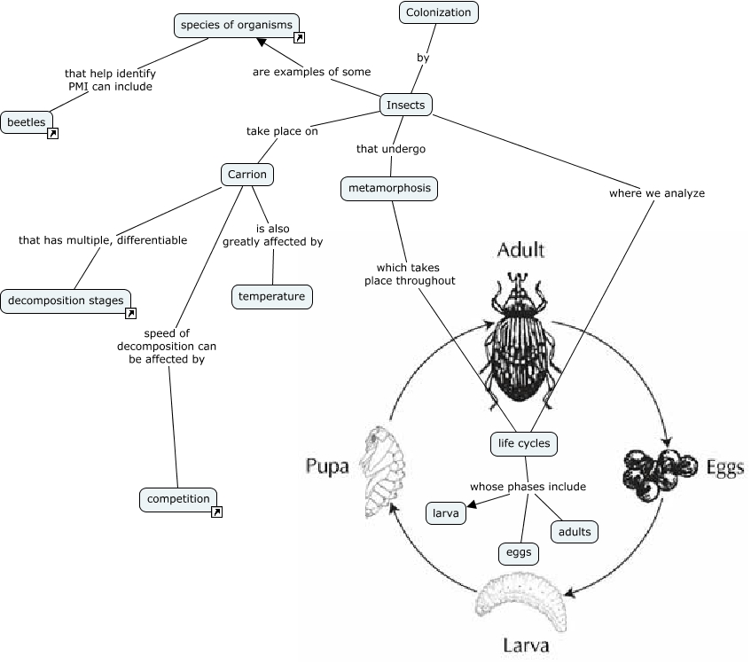This Concept Map, created with IHMC CmapTools, has information related to: PMI Concept Map, species of organisms that help identify PMI can include beetles, Carrion speed of decomposition can be affected by competition, Carrion that has multiple, differentiable decomposition stages, Insects where we analyze life cycles, life cycles whose phases include adults, Insects are examples of some species of organisms, metamorphosis which takes place throughout life cycles, life cycles whose phases include larva, Insects take place on Carrion, Colonization by Insects, Insects that undergo metamorphosis, Carrion is also greatly affected by temperature, life cycles whose phases include eggs