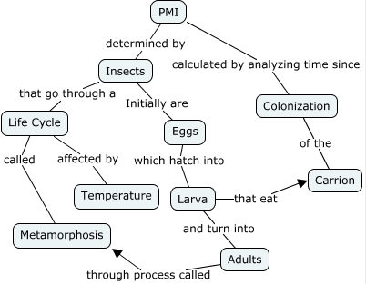 This Concept Map, created with IHMC CmapTools, has information related to: PMI 3, PMI calculated by analyzing time since Colonization, Eggs which hatch into Larva, Colonization of the Carrion, Larva and turn into Adults, PMI determined by Insects, Insects that go through a Life Cycle, Larva that eat Carrion, Life Cycle called Metamorphosis, Insects Initially are Eggs, Life Cycle affected by Temperature, Adults through process called Metamorphosis