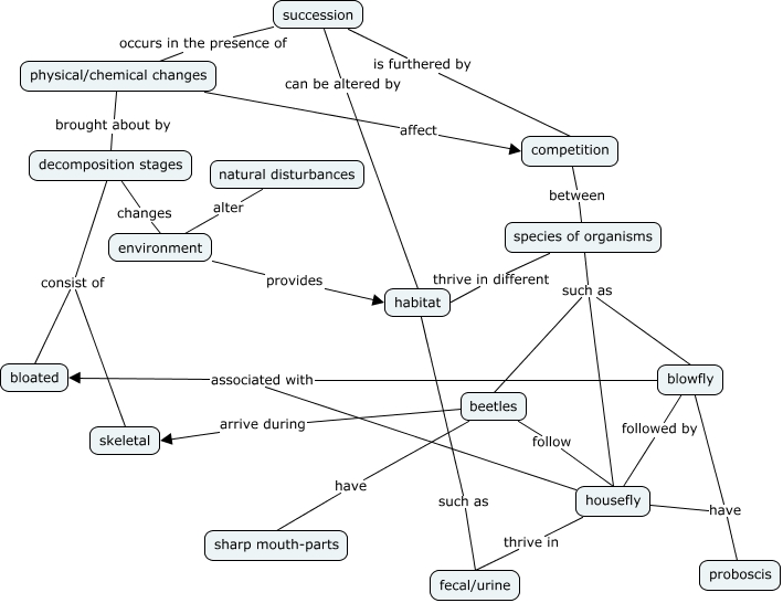 This Concept Map, created with IHMC CmapTools, has information related to: Succession, blowfly followed by housefly, beetles arrive during skeletal, blowfly associated with bloated, species of organisms thrive in different habitat, succession is furthered by competition, competition between species of organisms, environment provides habitat, decomposition stages consist of skeletal, physical/chemical changes affect competition, decomposition stages changes environment, physical/chemical changes brought about by decomposition stages, housefly associated with bloated, housefly have proboscis, blowfly have proboscis, species of organisms such as blowfly, housefly thrive in fecal/urine, succession occurs in the presence of physical/chemical changes, decomposition stages consist of bloated, beetles follow housefly, species of organisms such as beetles