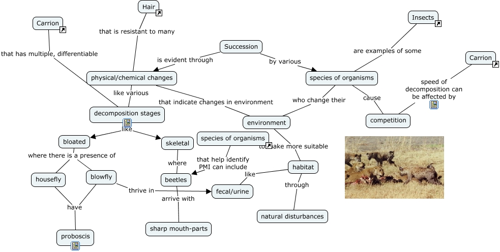 This Concept Map, created with IHMC CmapTools, has information related to: Succession, physical/chemical changes like various decomposition stages, Carrion that has multiple, differentiable decomposition stages, species of organisms who change their environment, habitat like fecal/urine, Succession is evident through physical/chemical changes, Carrion speed of decomposition can be affected by competition, environment to make more suitable habitat, habitat through natural disturbances, species of organisms that help identify PMI can include beetles, species of organisms cause competition, decomposition stages like skeletal, blowfly thrive in fecal/urine, bloated where there is a presence of blowfly, beetles arrive with sharp mouth-parts, physical/chemical changes that indicate changes in environment environment, housefly have proboscis, decomposition stages like bloated, Insects are examples of some species of organisms, Succession by various species of organisms, skeletal where beetles