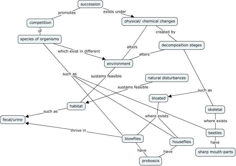 This Concept Map, created with IHMC CmapTools, has information related to: Succession Cmap, succession exists under physical/ chemical changes, natural disturbances sustains feasible habitat, species of organisms such as blowflies, blowflies have proboscis, physical/ chemical changes created by decomposition stages, competition of species of organisms, environment sustains feasible habitat, decomposition stages such as bloated, beetles have sharp mouth-parts, decomposition stages such as skeletal, bloated where exists houseflies, habitat such as fecal/urine, species of organisms which exist in different environment, succession promotes competition, decomposition stages alters environment, blowflies thrive in fecal/urine, houseflies have proboscis, species of organisms such as beetles, species of organisms such as houseflies, bloated where exists blowflies