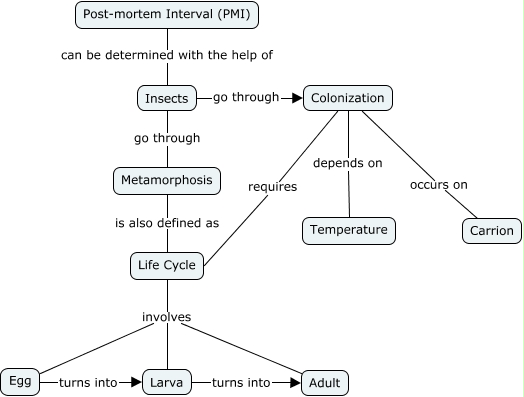 This Concept Map, created with IHMC CmapTools, has information related to: PMI, Life Cycle involves Egg, Life Cycle involves Larva, Egg turns into Larva, Insects go through Metamorphosis, Metamorphosis is also defined as Life Cycle, Colonization occurs on Carrion, Life Cycle involves Adult, Larva turns into Adult, Post-mortem Interval (PMI) can be determined with the help of Insects, Colonization depends on Temperature, Colonization requires Life Cycle, Insects go through Colonization