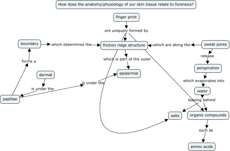 This Concept Map, created with IHMC CmapTools, has information related to: Skin Tissue, organic compounds such as amino acids, perspiration which evaporates into water, finger print are uniquely formed by friction ridge structure, sweat pores release perspiration, finger print are uniquely formed by organic compounds, dermal is under the papillae, papillae forms a boundary, finger print are uniquely formed by salts, boundary which determines the friction ridge structure, water leaving behind organic compounds, water leaving behind salts, papillae is under the epidermal, sweat pores which are along the friction ridge structure, friction ridge structure which is part of the outer epidermal