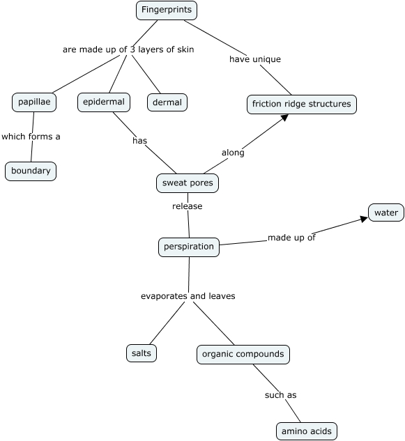This Concept Map, created with IHMC CmapTools, has information related to: Finger Prints, sweat pores release perspiration, Fingerprints are made up of 3 layers of skin dermal, Fingerprints are made up of 3 layers of skin epidermal, perspiration evaporates and leaves salts, perspiration evaporates and leaves organic compounds, sweat pores along friction ridge structures, Fingerprints are made up of 3 layers of skin papillae, papillae which forms a boundary, perspiration made up of water, epidermal has sweat pores, Fingerprints have unique friction ridge structures, organic compounds such as amino acids