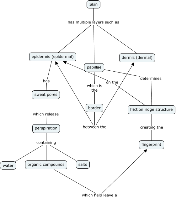 This Concept Map, created with IHMC CmapTools, has information related to: Skin, epidermis (epidermal) has sweat pores, border between the dermis (dermal), perspiration containing salts, sweat pores which release perspiration, papillae determines friction ridge structure, Skin has multiple layers such as dermis (dermal), perspiration containing organic compounds, organic compounds which help leave a fingerprint, friction ridge structure creating the fingerprint, perspiration containing water, papillae which is the border, Skin has multiple layers such as papillae, friction ridge structure on the epidermis (epidermal), border between the epidermis (epidermal), Skin has multiple layers such as epidermis (epidermal)