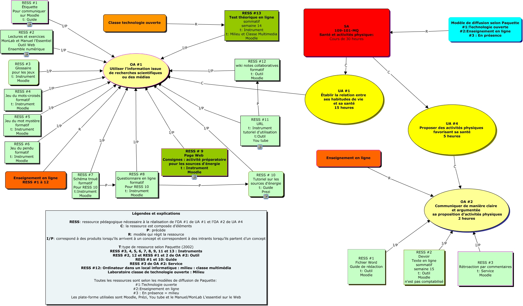 Cette carte de concepts créée avec IHMC CmapTools traite de: Johanne, RESS #5 Jeu du mot mystère formatif t: Instrument Moodle I/P OA #1 Utiliser l’information issue de recherches scientifiques ou des médias, UA #1 Établir la relation entre ses habitudes de vie et sa santé 15 heures C OA #1 Utiliser l’information issue de recherches scientifiques ou des médias, RESS #6 Jeu du pendu formatif t: Instrument Moodle I/P OA #1 Utiliser l’information issue de recherches scientifiques ou des médias, Enseignement en ligne RESS #1 à 12 R OA #1 Utiliser l’information issue de recherches scientifiques ou des médias, SA 109-101-MQ Santé et activités physiques Cours de 30 heures C UA #1 Établir la relation entre ses habitudes de vie et sa santé 15 heures, RESS #1 Fichier Word Guide de rédaction t: Outil Moodle I/P ????, RESS #2 Lectures et exercices MonLab et Manuel l'Essentiel Outil Web Ensemble numérique I/P OA #1 Utiliser l’information issue de recherches scientifiques ou des médias, RESS #2 Devoir Texte en ligne sommatif semaine 15 t: Outil Moodle n'est pas comptabilisé I/P OA #2 Communiquer de manière claire et argumentée sa proposition d’activités physiques 2 heures, RESS #13 Test théorique en ligne sommatif semaine 14 t: Instrument t: Milieu et Classe Multimedia Moodle I/P OA #1 Utiliser l’information issue de recherches scientifiques ou des médias, UA #4 Proposer des activités physiques favorisant sa santé 5 heures C OA #2 Communiquer de manière claire et argumentée sa proposition d’activités physiques 2 heures, Enseignement en ligne R OA #2 Communiquer de manière claire et argumentée sa proposition d’activités physiques 2 heures, RESS #7 Schéma troué formatif Pour RESS 10 t:Instrument Moodle I/P OA #1 Utiliser l’information issue de recherches scientifiques ou des médias, RESS #11 URL t: Instrument tutoriel d'utilisation t:Outil You tube P RESS #12 wiki notes collaboratives formatif t: Outil Moodle, SA 109-101-MQ Santé et activités physiques Cours de 30 heures C UA #4 Proposer des activités physiques favorisant sa santé 5 heures, RESS #3 Glossaire pour les jeux t: Instrument Moodle I/P OA #1 Utiliser l’information issue de recherches scientifiques ou des médias, RESS #8 Questionnaire en ligne formatif Pour RESS 10 t: Instrument Moodle P RESS # 10 Tutoriel sur les sources d’énergie t: Guide Prezi, Classe technologie ouverte R RESS #13 Test théorique en ligne sommatif semaine 14 t: Instrument t: Milieu et Classe Multimedia Moodle, RESS #8 Questionnaire en ligne formatif Pour RESS 10 t: Instrument Moodle I/P OA #1 Utiliser l’information issue de recherches scientifiques ou des médias, RESS #3 Rétroaction par commentaires t: Service Moodle I/P OA #2 Communiquer de manière claire et argumentée sa proposition d’activités physiques 2 heures, RESS #1 Étiquette Pour communiquer sur Moodle t: Guide I/P OA #1 Utiliser l’information issue de recherches scientifiques ou des médias