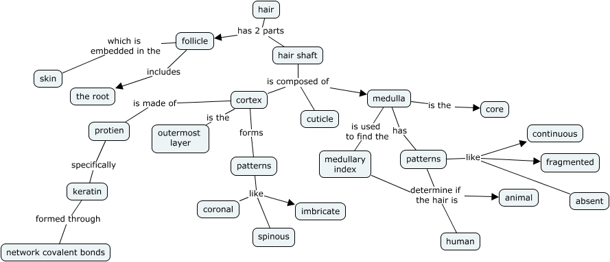 This Concept Map, created with IHMC CmapTools, has information related to: What is the structure of hair, medullary index determine if the hair is human, cortex is the outermost layer, hair shaft is composed of cuticle, patterns like absent, hair shaft is composed of cortex, keratin formed through network covalent bonds, follicle includes the root, patterns like continuous, cortex is made of protien, hair has 2 parts follicle, patterns like imbricate, patterns like fragmented, cortex forms patterns, patterns determine if the hair is human, protien specifically keratin, medullary index determine if the hair is animal, follicle which is embedded in the skin, medulla has patterns, medulla is used to find the medullary index, medulla is the core
